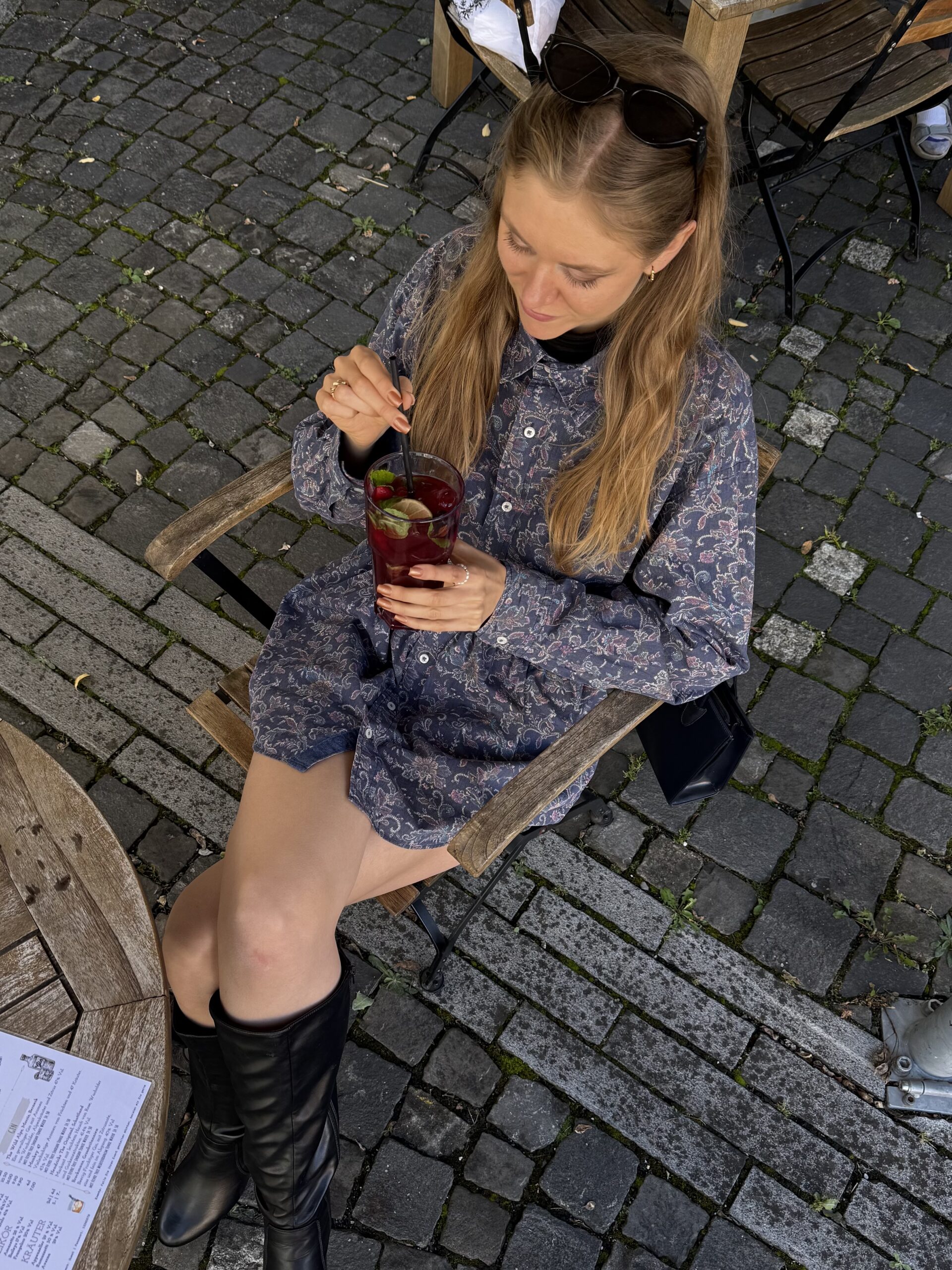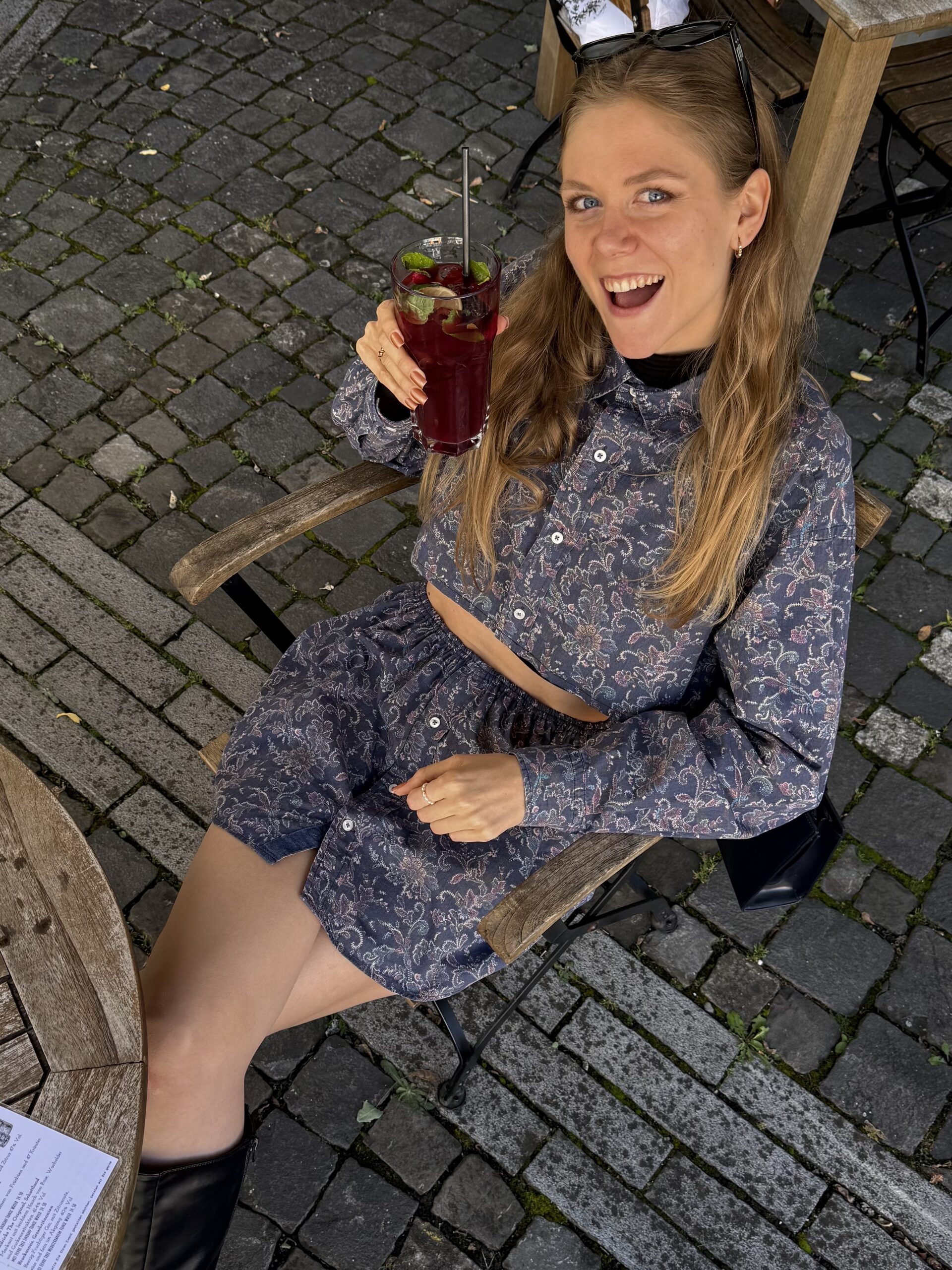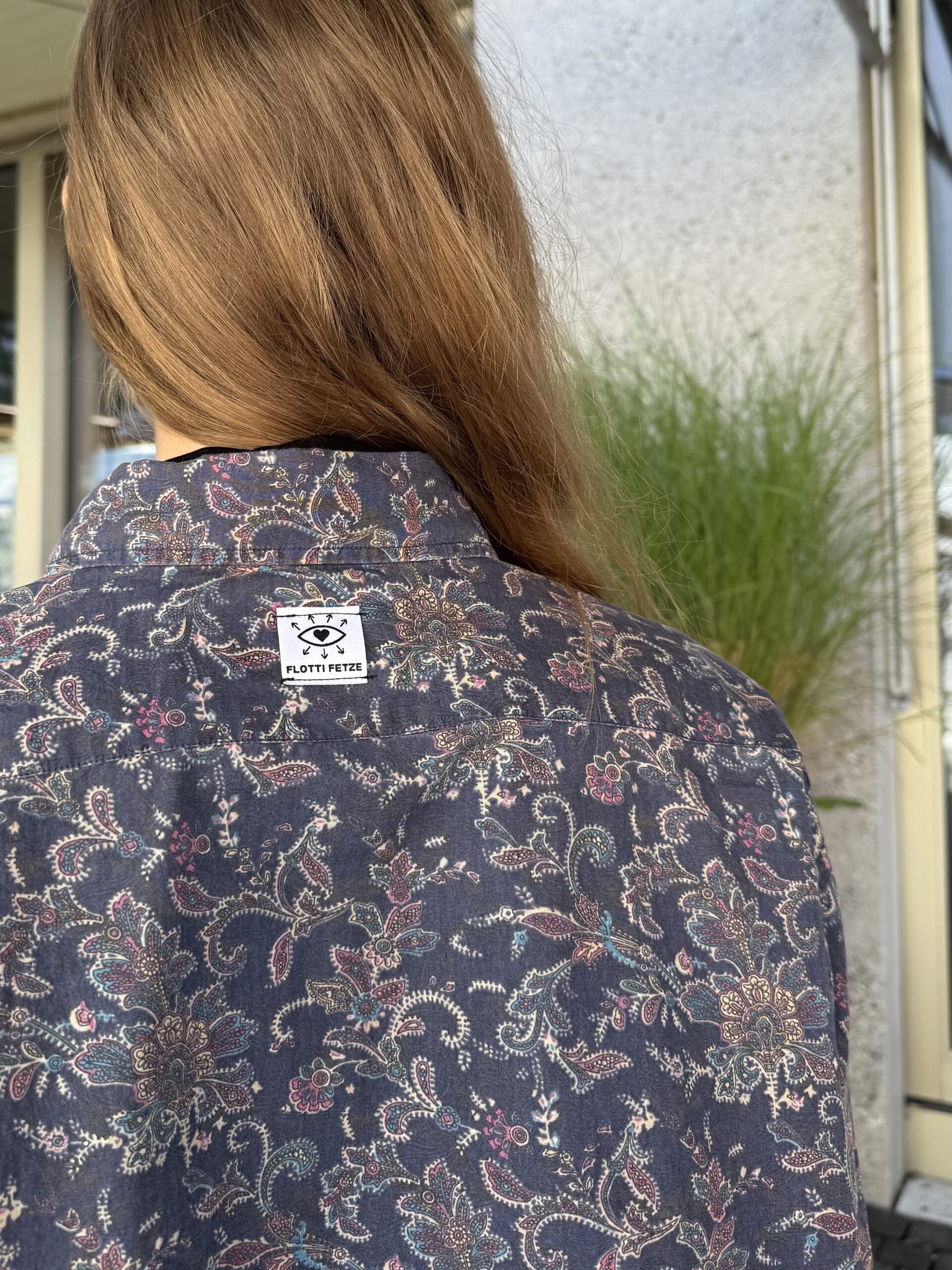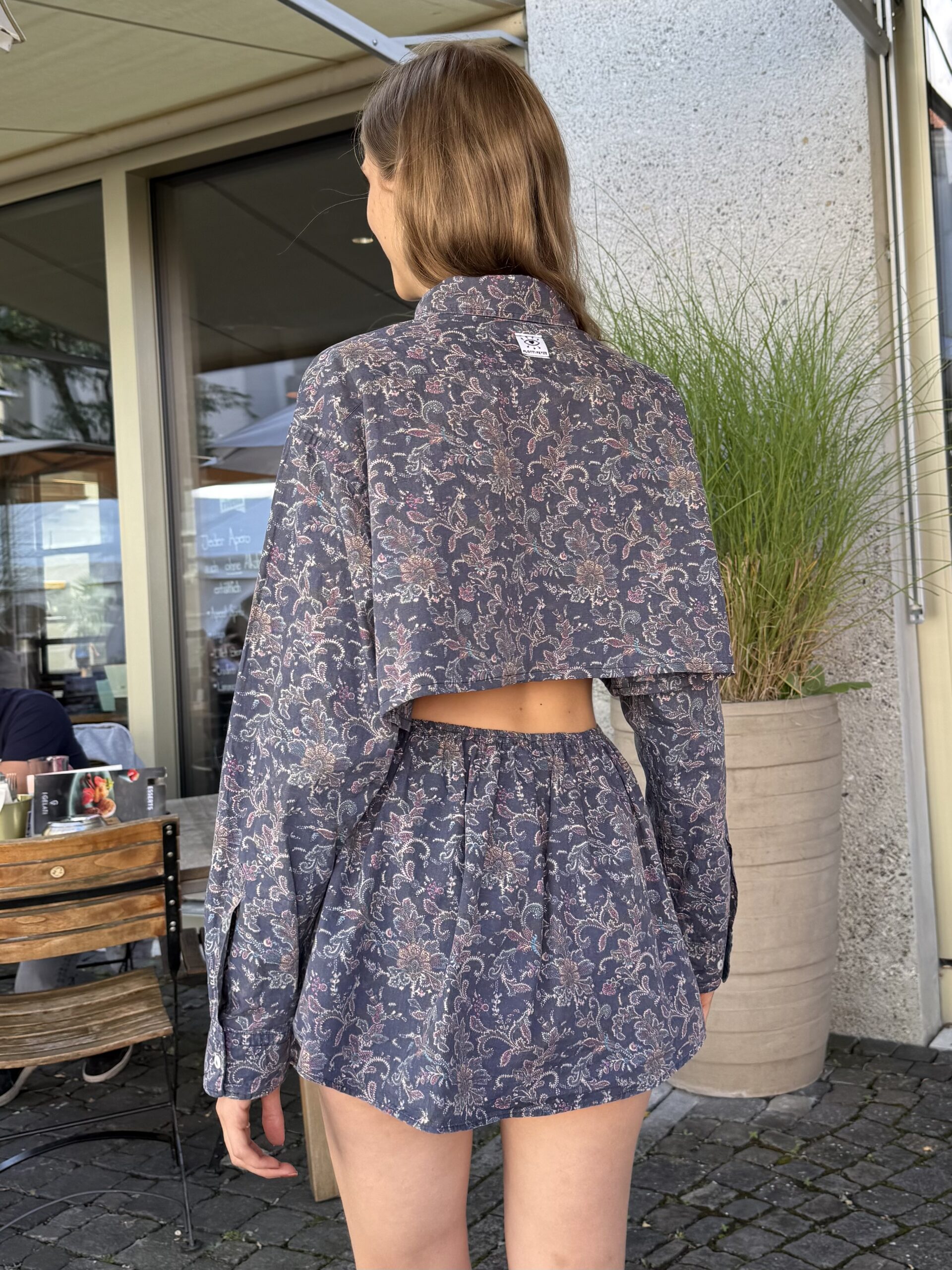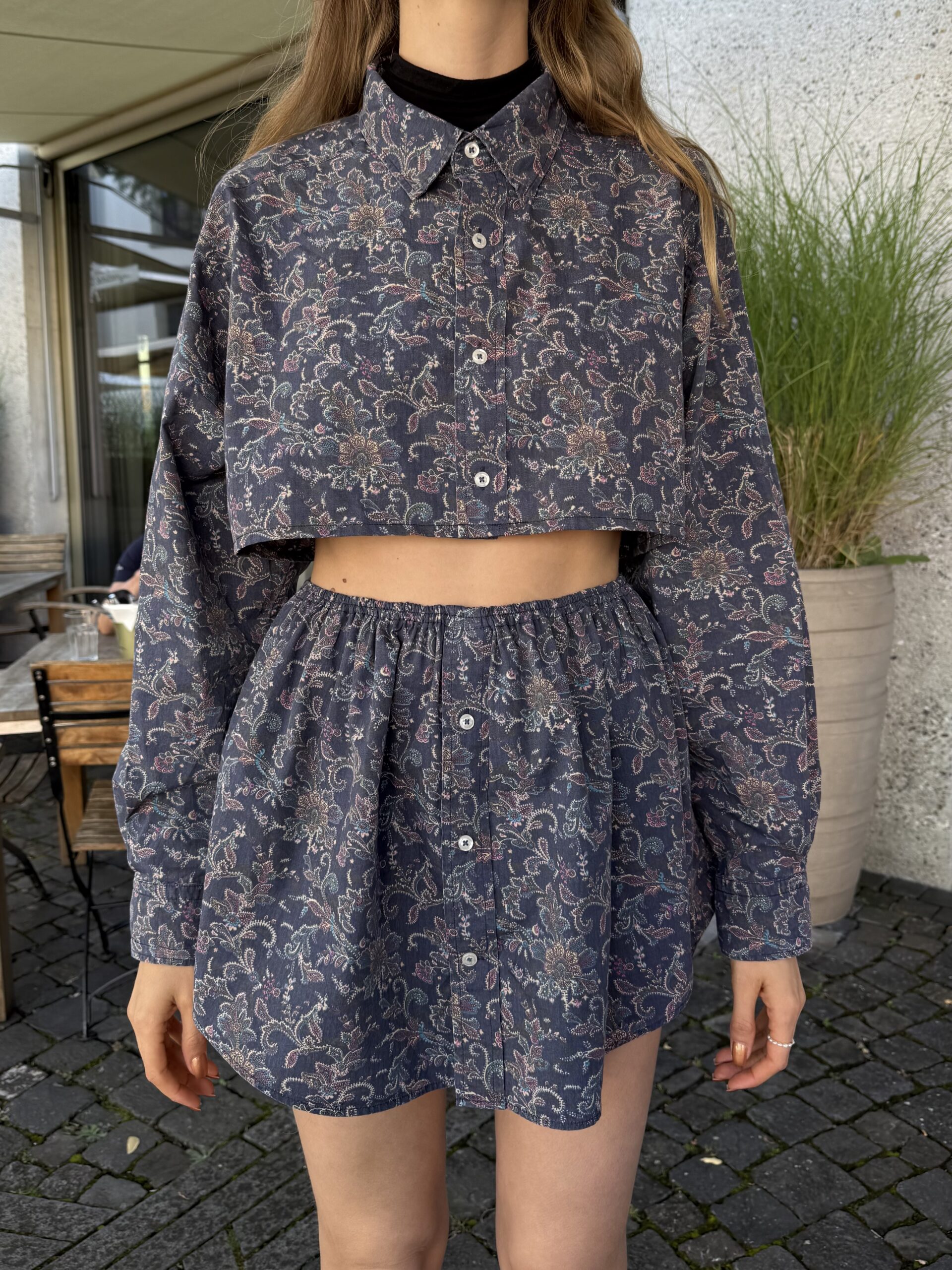 Dieser Upcycling-Zweiteiler ist ein absolutes Statement-Piece: Aus einem alten Männerhemd haben wir ein modernes Set aus Oberteil und Rock kreiert. Das auffällige, verspielte Muster in den angesagten Herbstfarben macht jedes Outfit zu einem Hingucker.