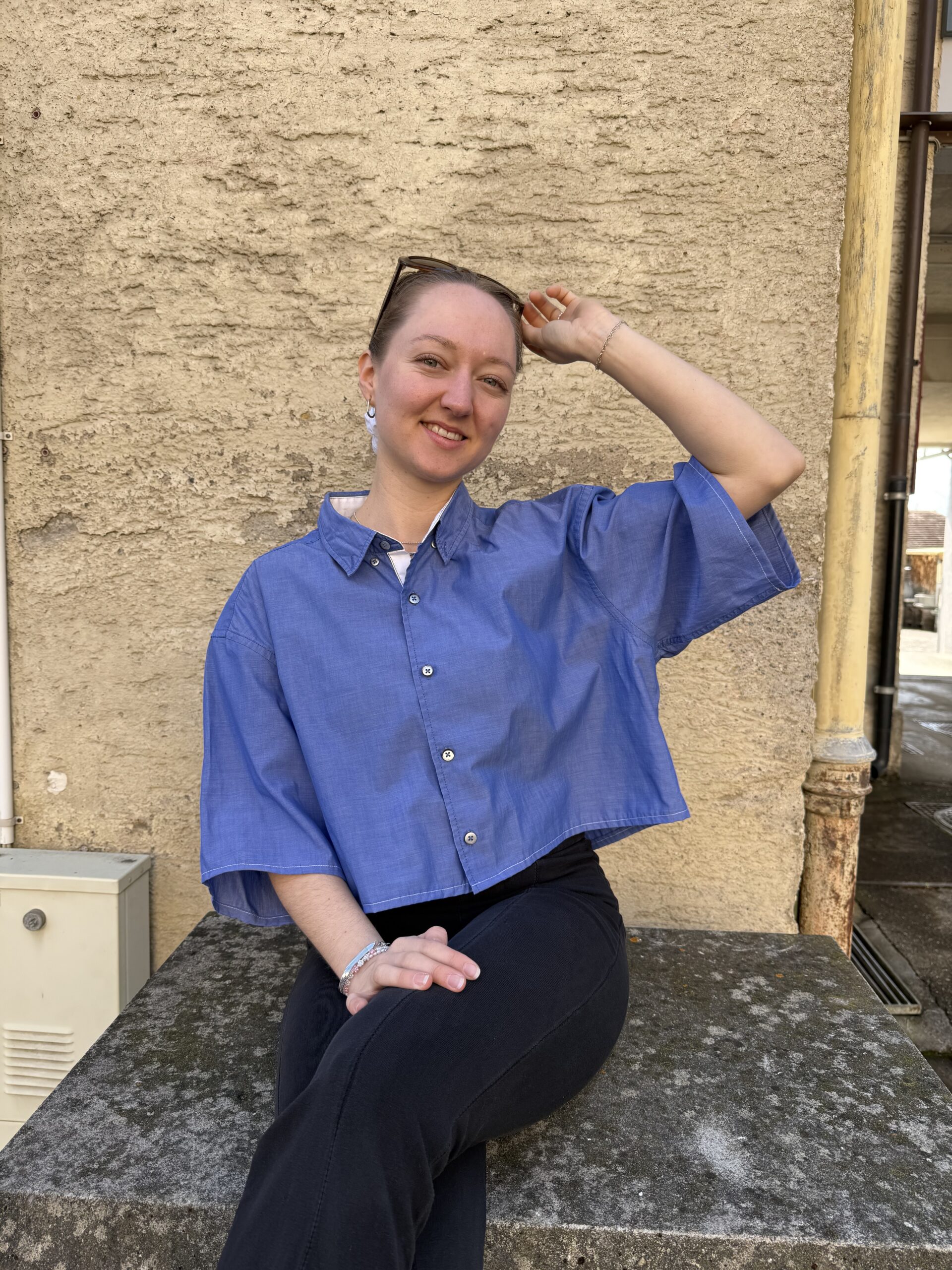 Dieses upcycelte Hemd wurde mit viel Liebe zum Detail neu gestaltet und in eine moderne, kürzere Form gebracht.
