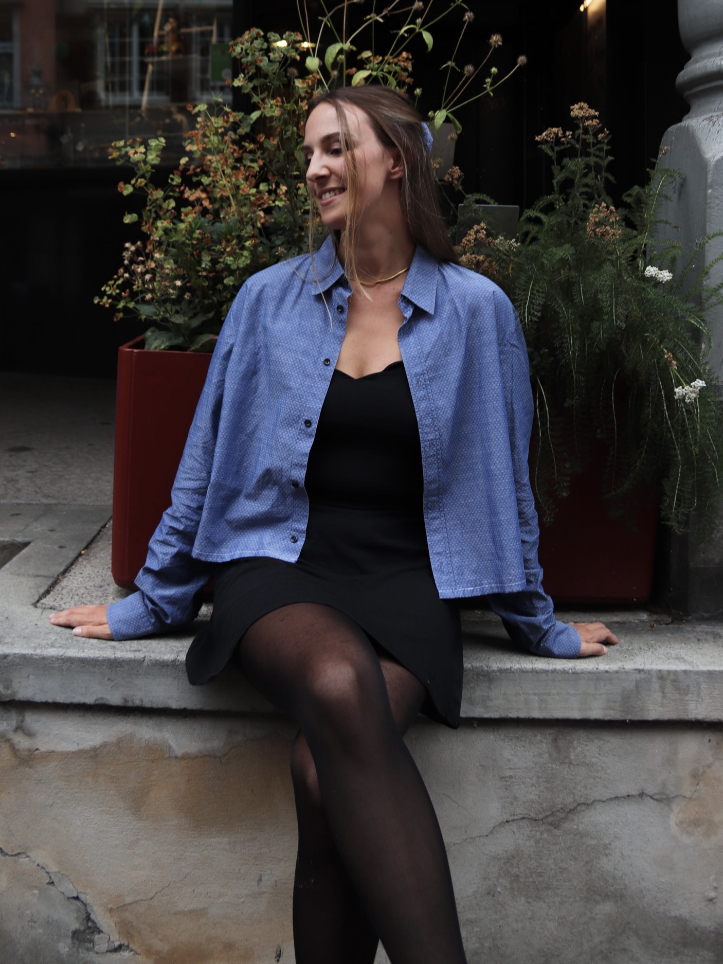 Dieses Hemd wurde upgecycelt und zu einem modernen Cropped Shirt gekürzt. Damit kein Stoff verloren geht, haben wir aus dem Restmaterial einen passenden Scrunchie genäht. Das Ergebnis ist ein einzigartiges Set, das Modebewusstsein mit Umweltbewusstsein verbindet.