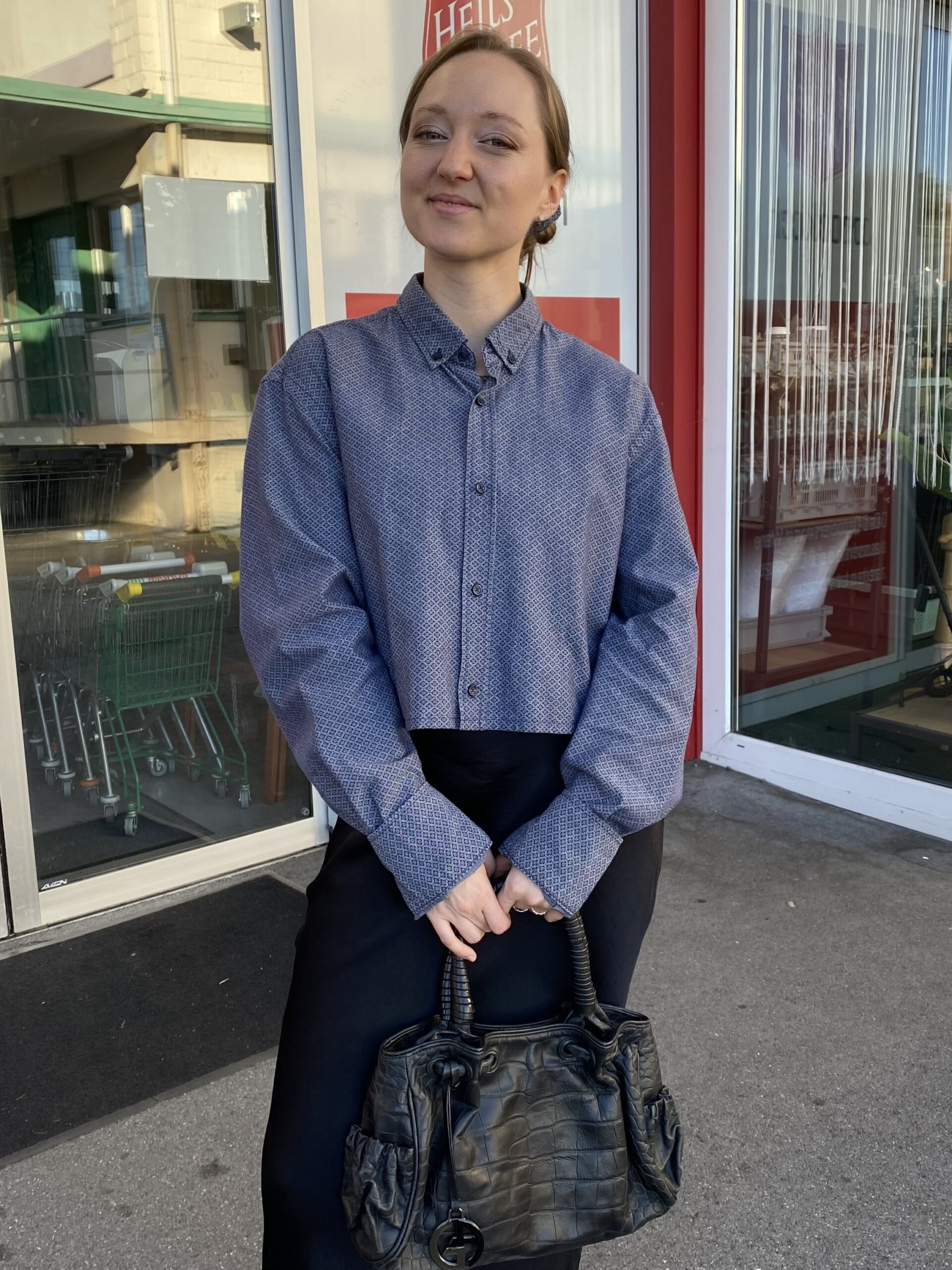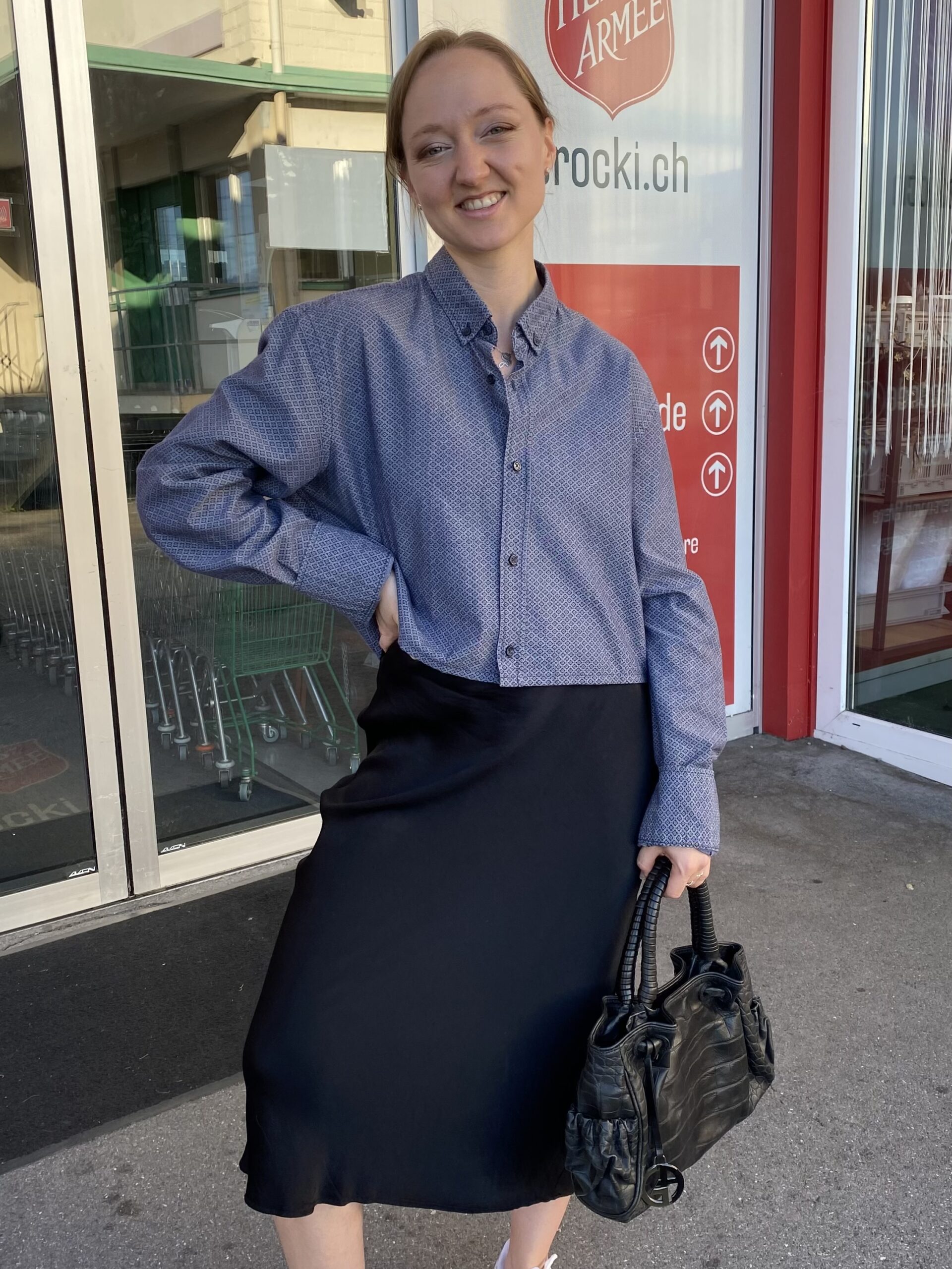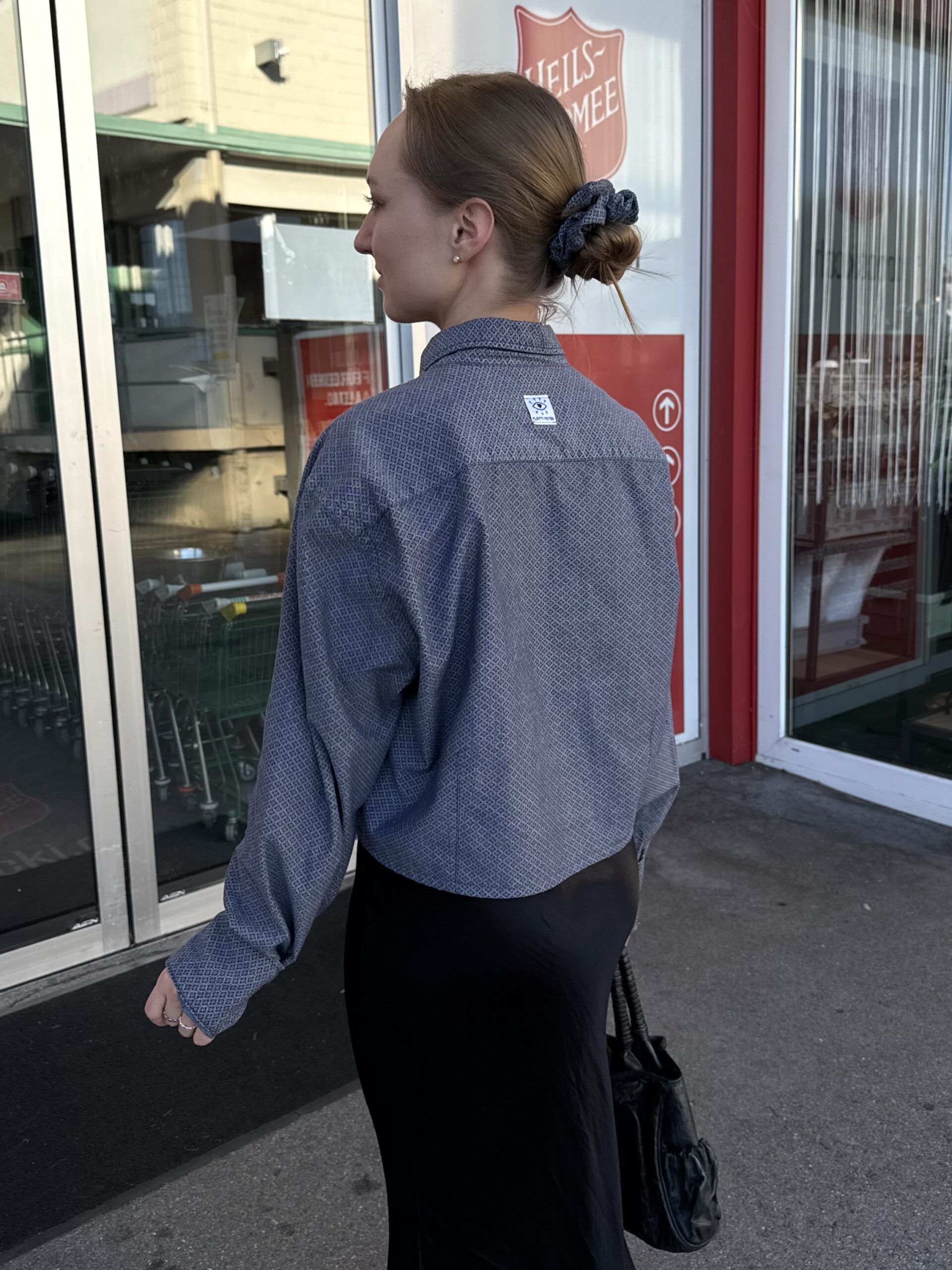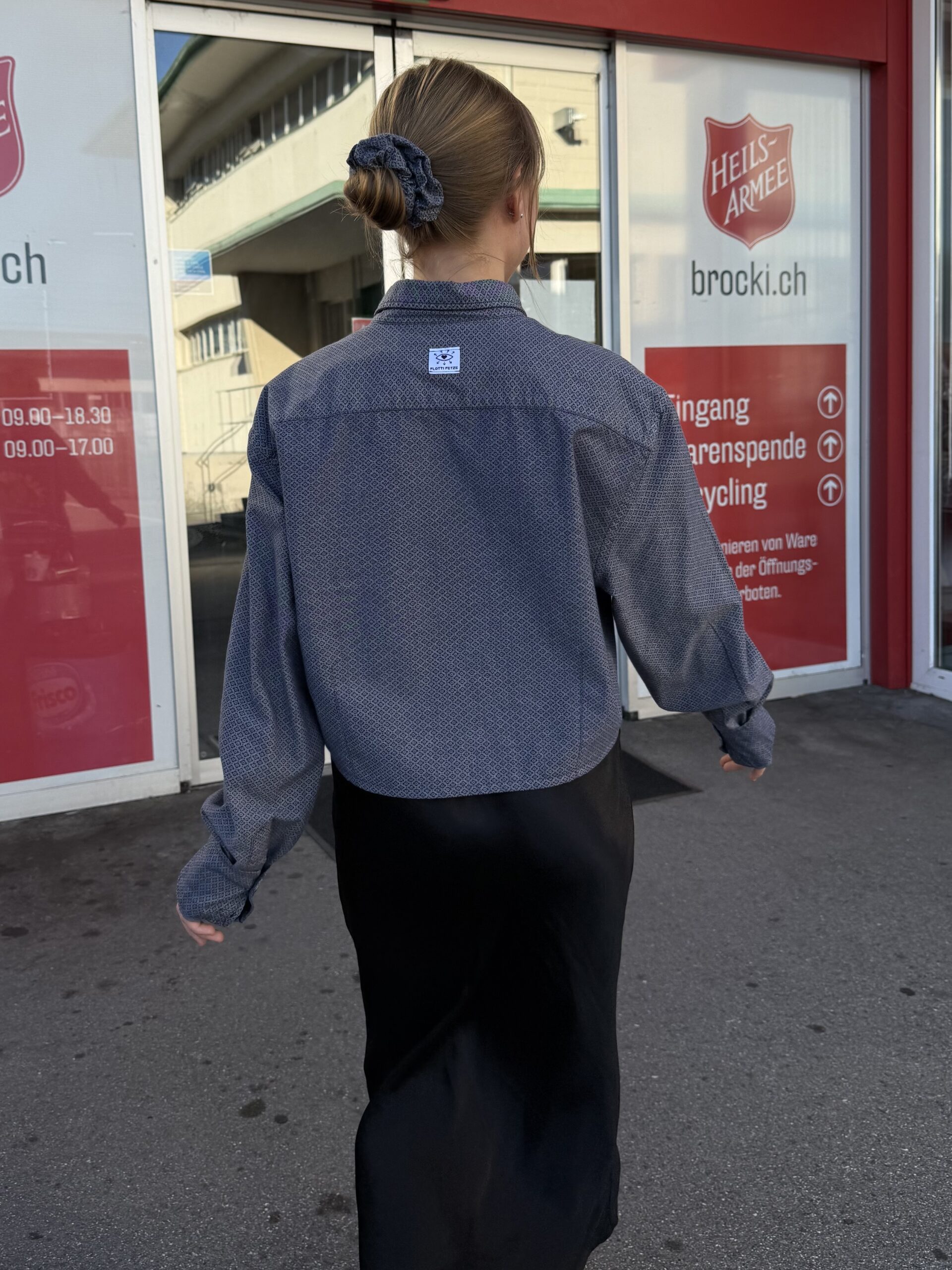 Dieses dunkelblaue Hemd wurde im Upcycling-Design aus einem klassischen Männerhemd gefertigt und individuell gekürzt. Durch den modernen Cropped-Schnitt entsteht ein frischer Look, der sich perfekt zu High-Waist-Jeans, Röcken oder Shorts kombinieren lässt.