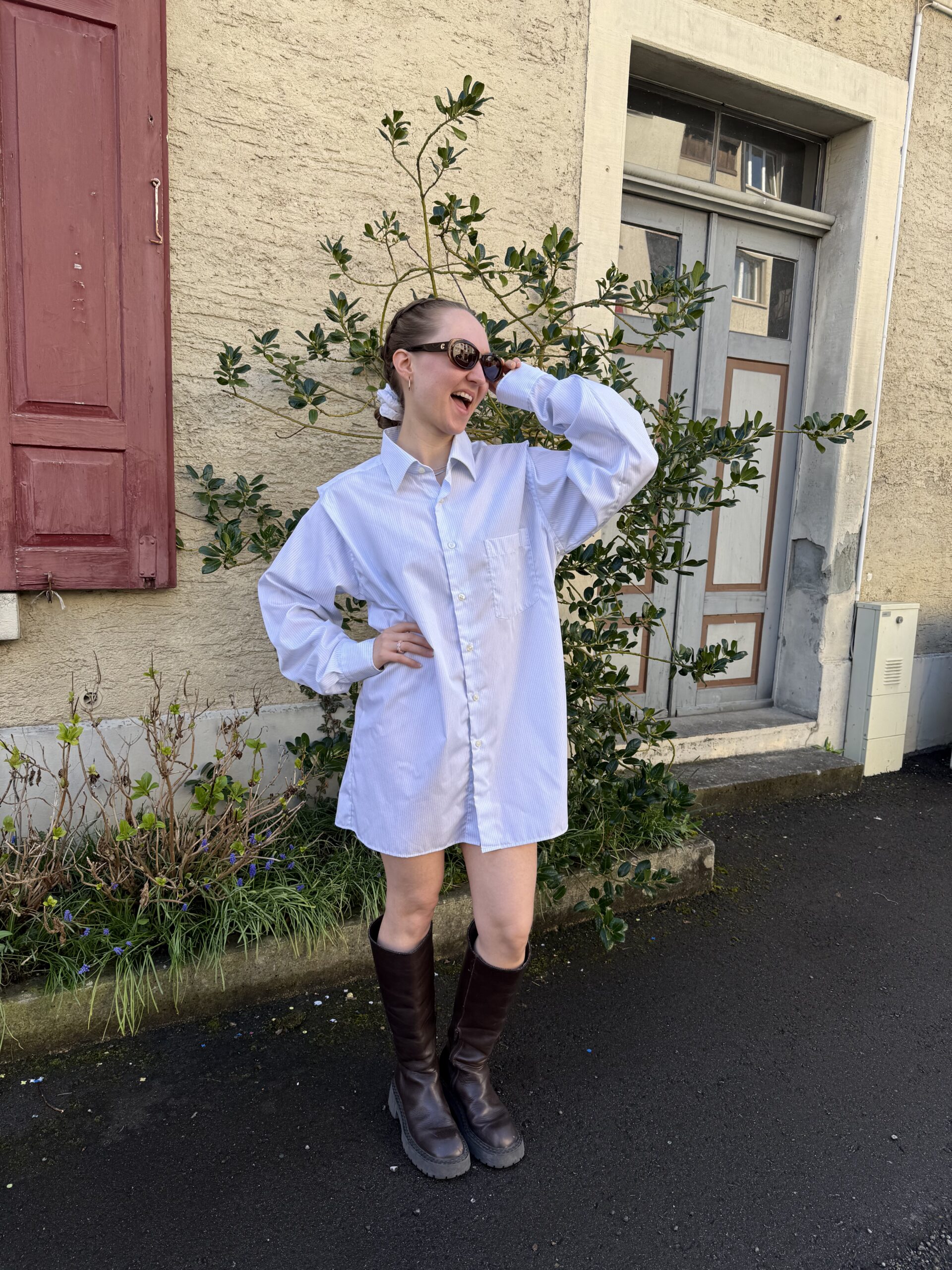 Dieses upcycelte Hemd wurde mit viel Liebe zum Detail neu gestaltet und in eine moderne, kürzere Form gebracht.