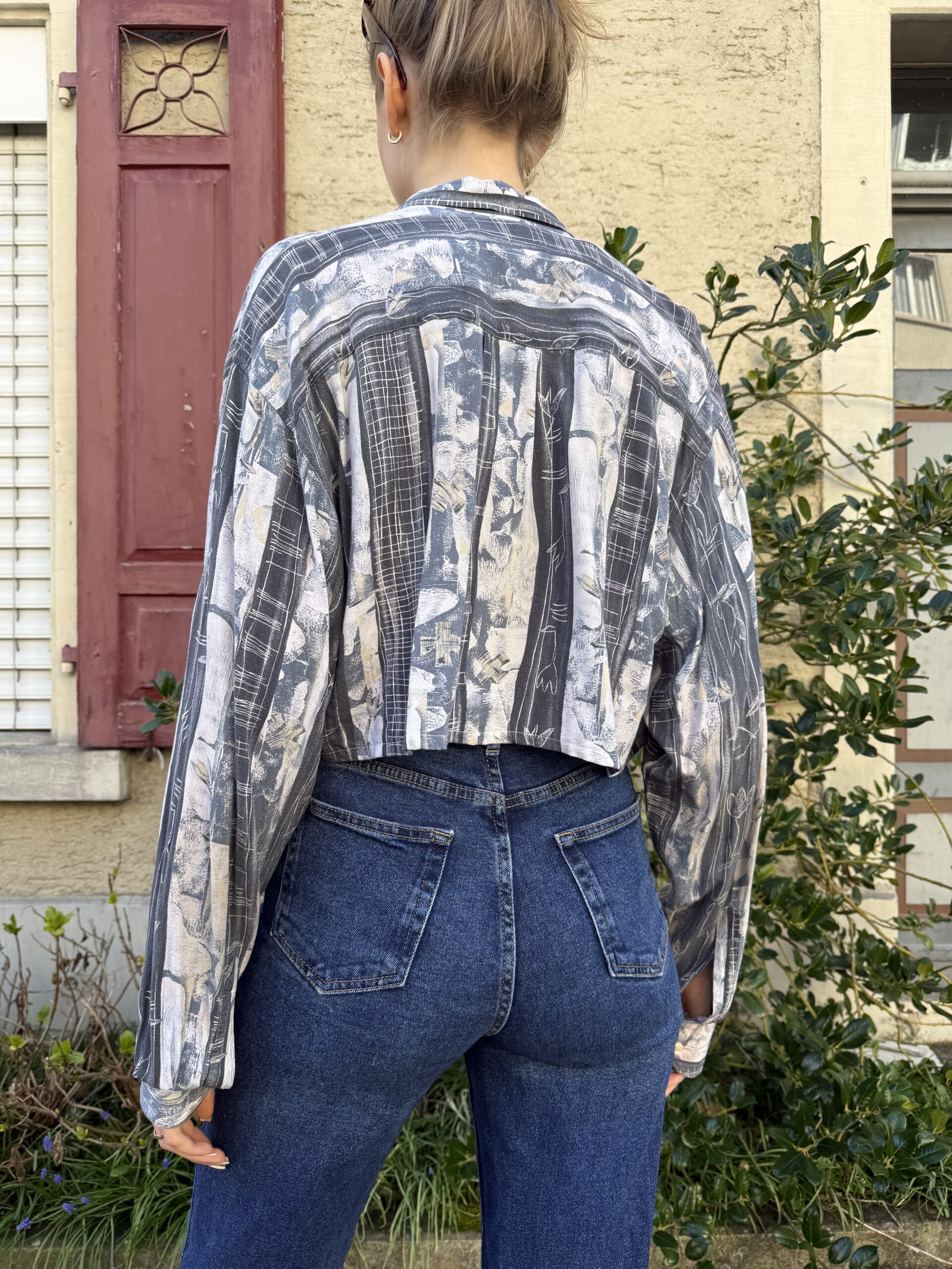Dieses upcycelte Hemd wurde mit viel Liebe zum Detail neu gestaltet und in eine moderne, kürzere Form gebracht. Aus dem restlichen Stoff ist ein passendes Scrunchie entstanden – so entsteht ein harmonisches Set, das nicht nur stylisch, sondern auch nachhaltig ist.