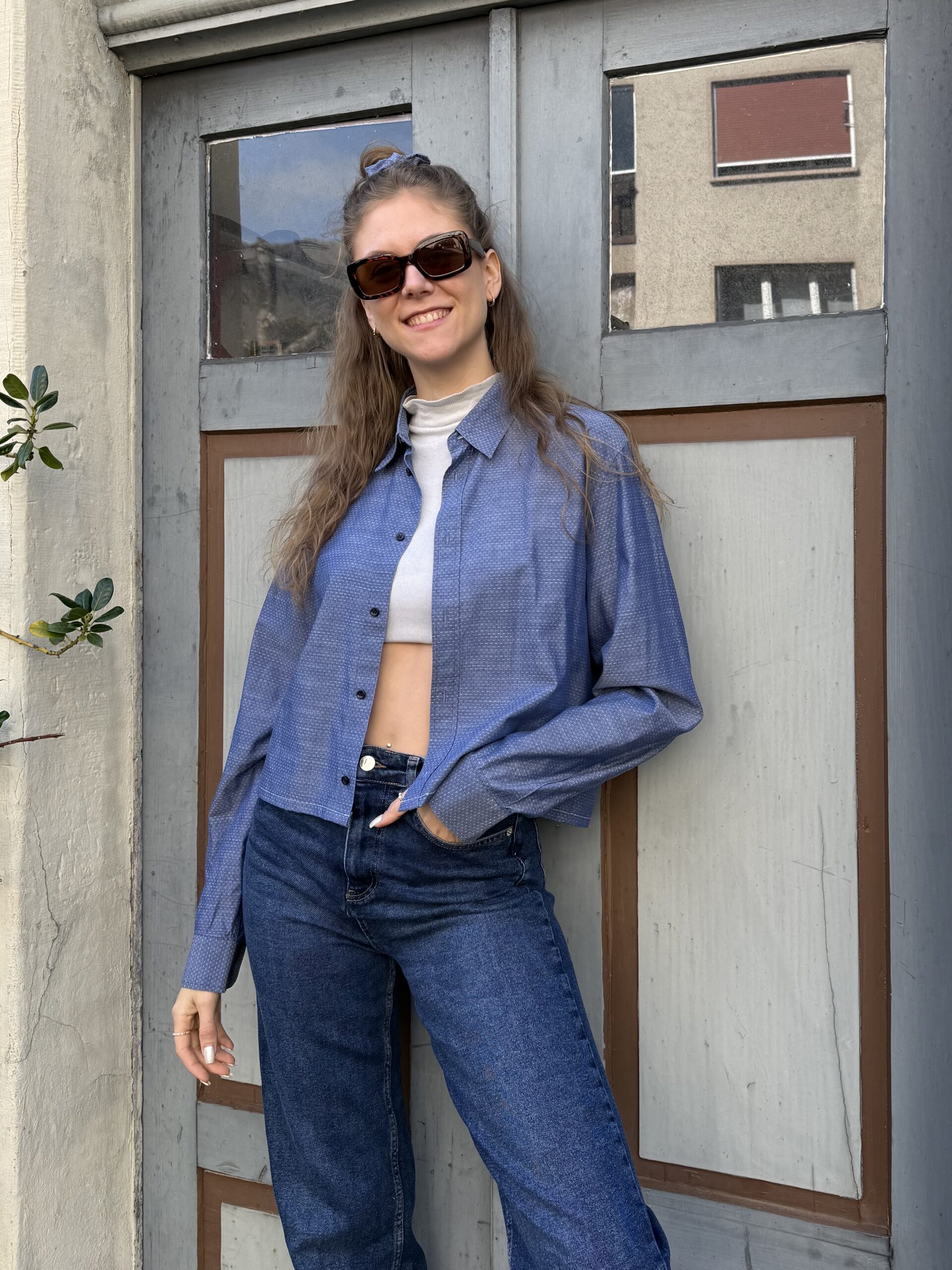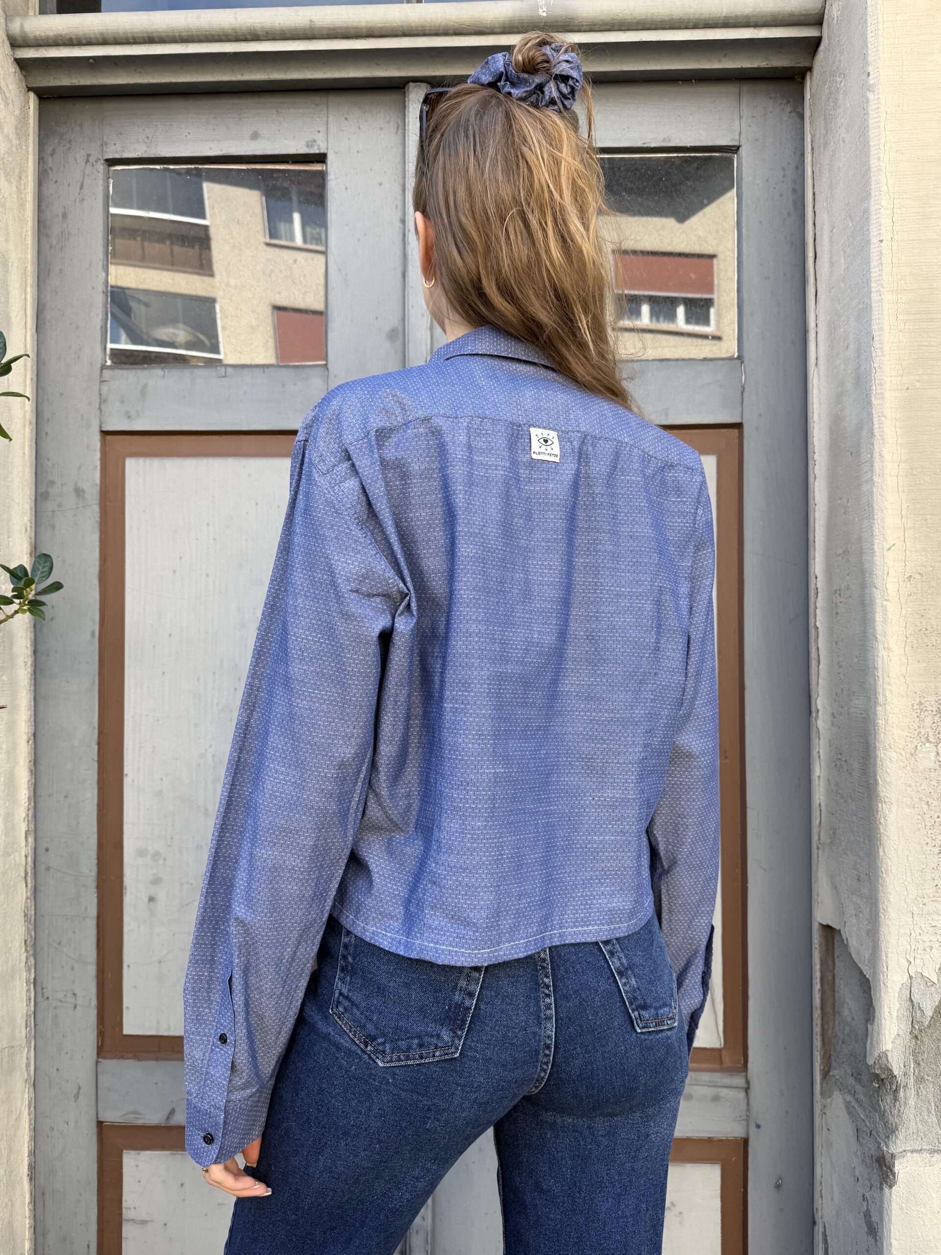 Dieses upcycelte Hemd wurde mit viel Liebe zum Detail neu gestaltet und in eine moderne, kürzere Form gebracht. Aus dem restlichen Stoff ist ein passendes Scrunchie entstanden – so entsteht ein harmonisches Set, das nicht nur stylisch, sondern auch nachhaltig ist.