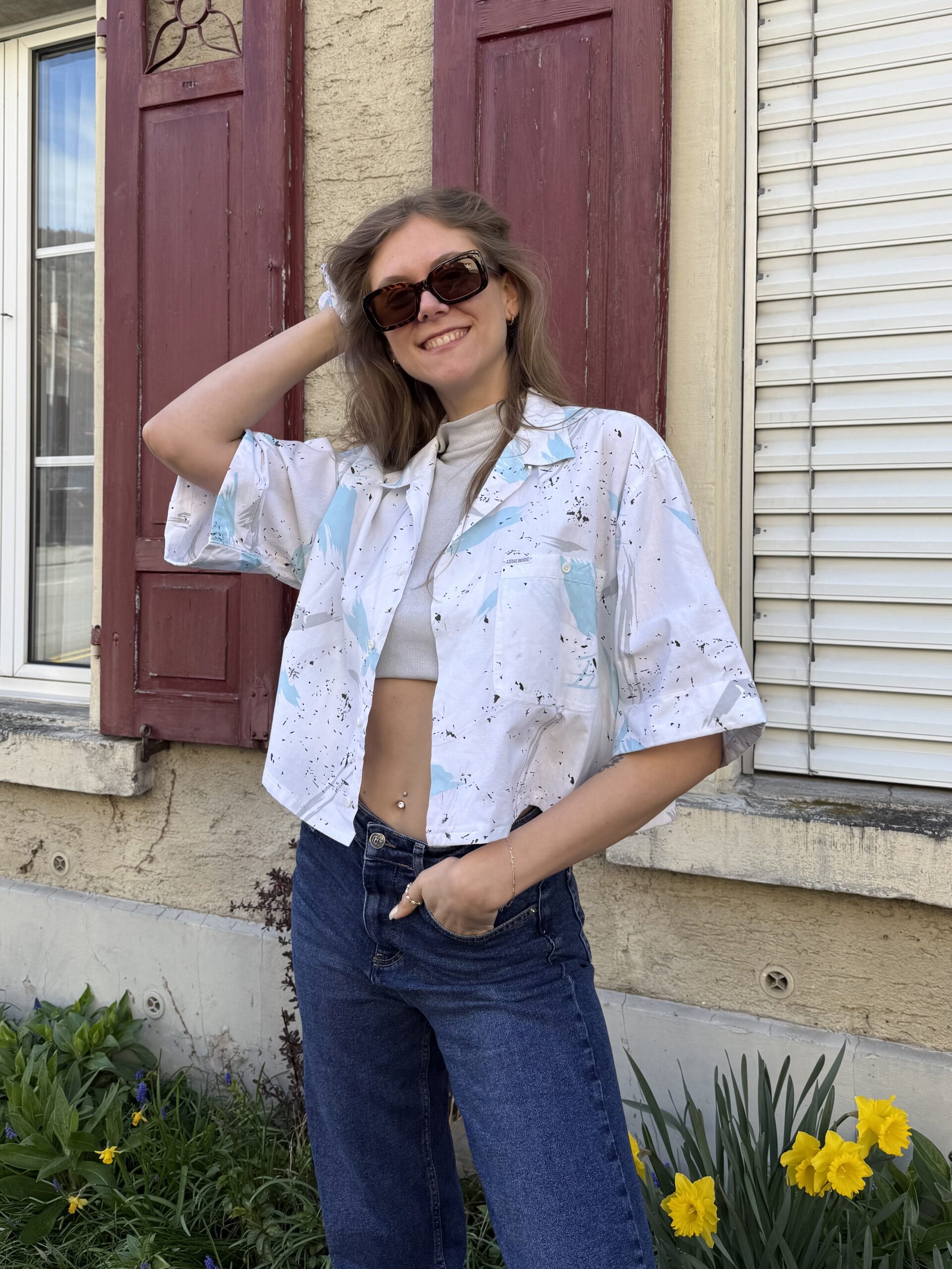 Dieses upcycelte Hemd wurde mit viel Liebe zum Detail neu gestaltet und in eine moderne, kürzere Form gebracht. Aus dem restlichen Stoff ist ein passendes Scrunchie entstanden – so entsteht ein harmonisches Set, das nicht nur stylisch, sondern auch nachhaltig ist.