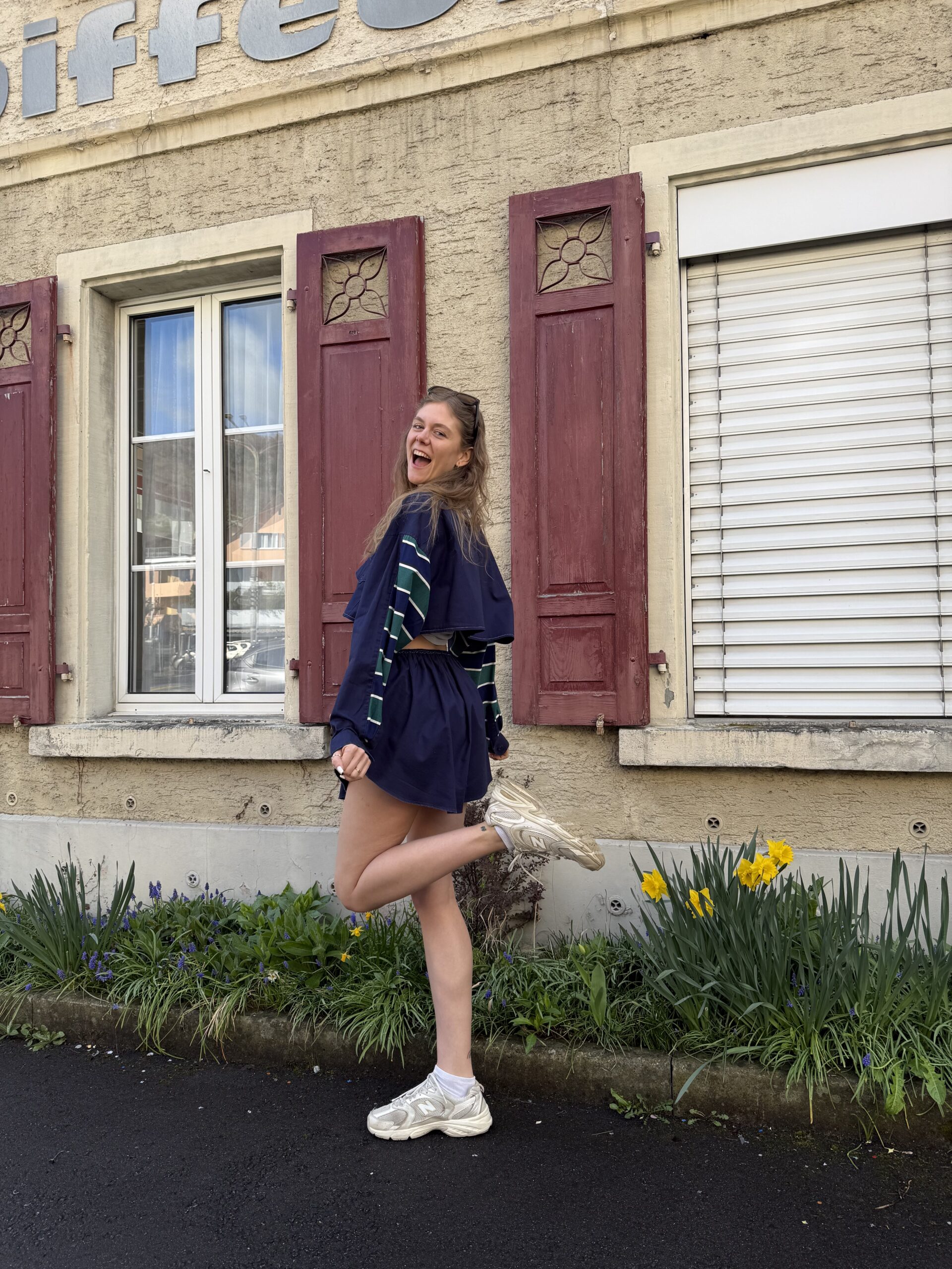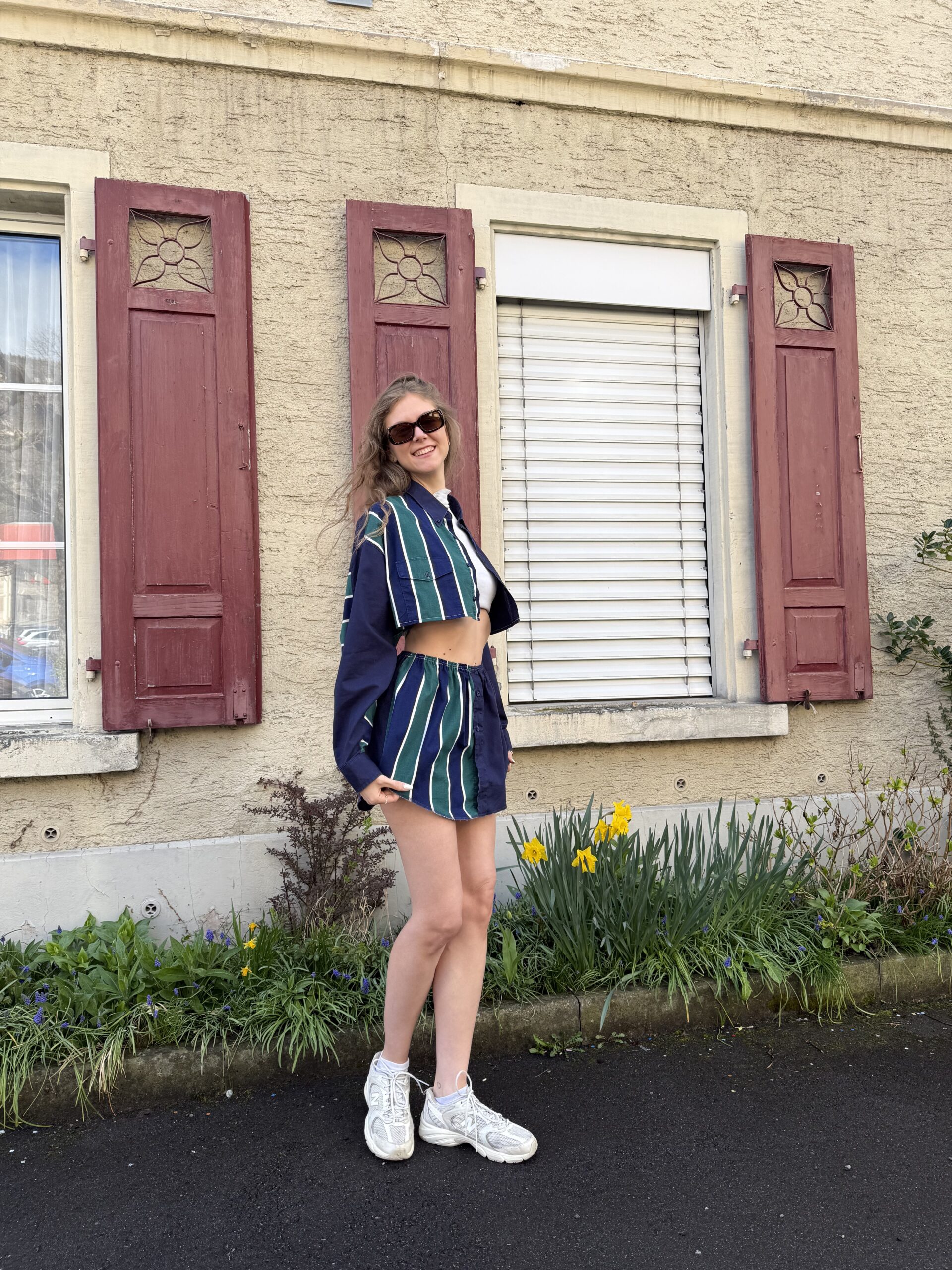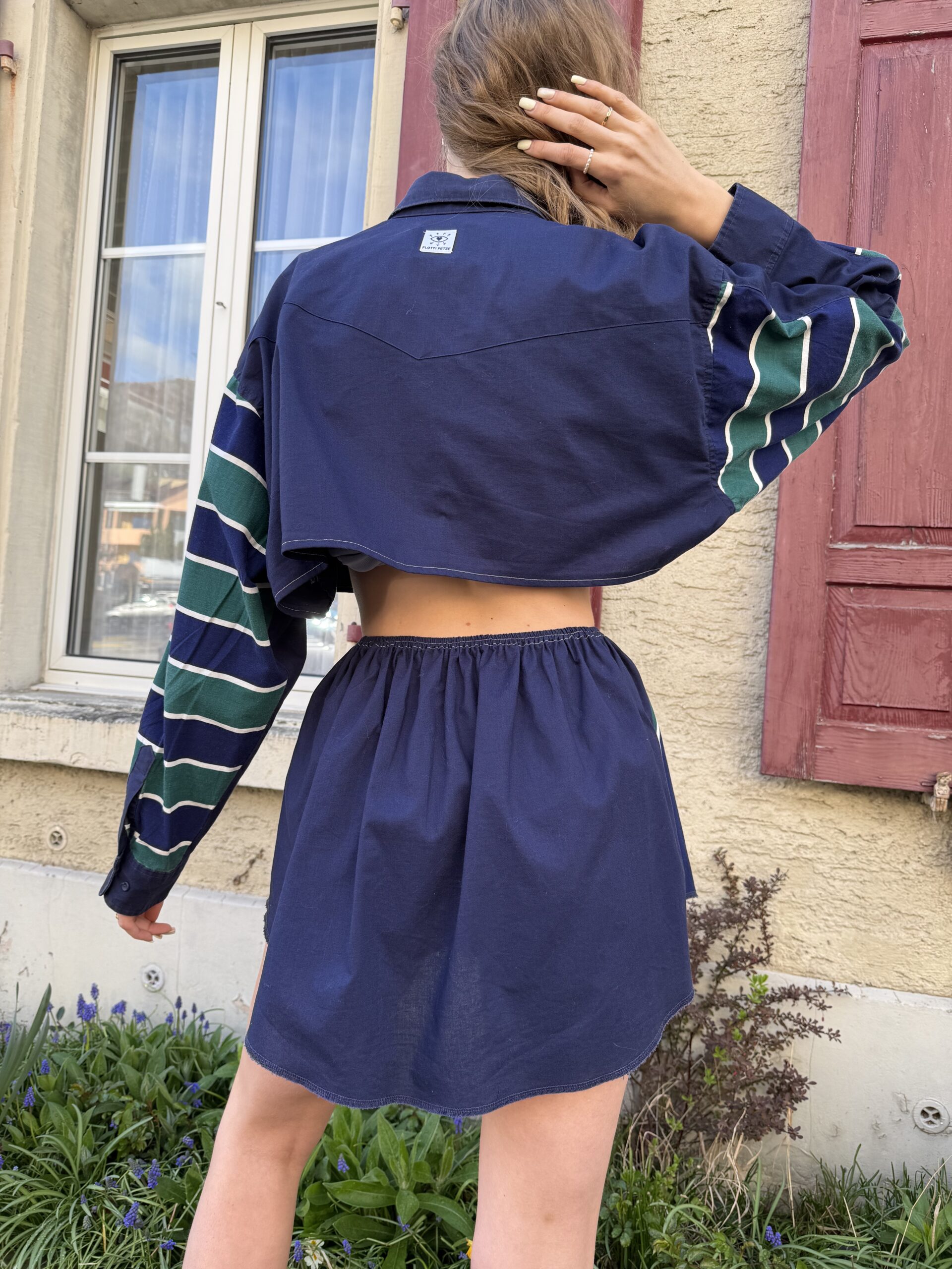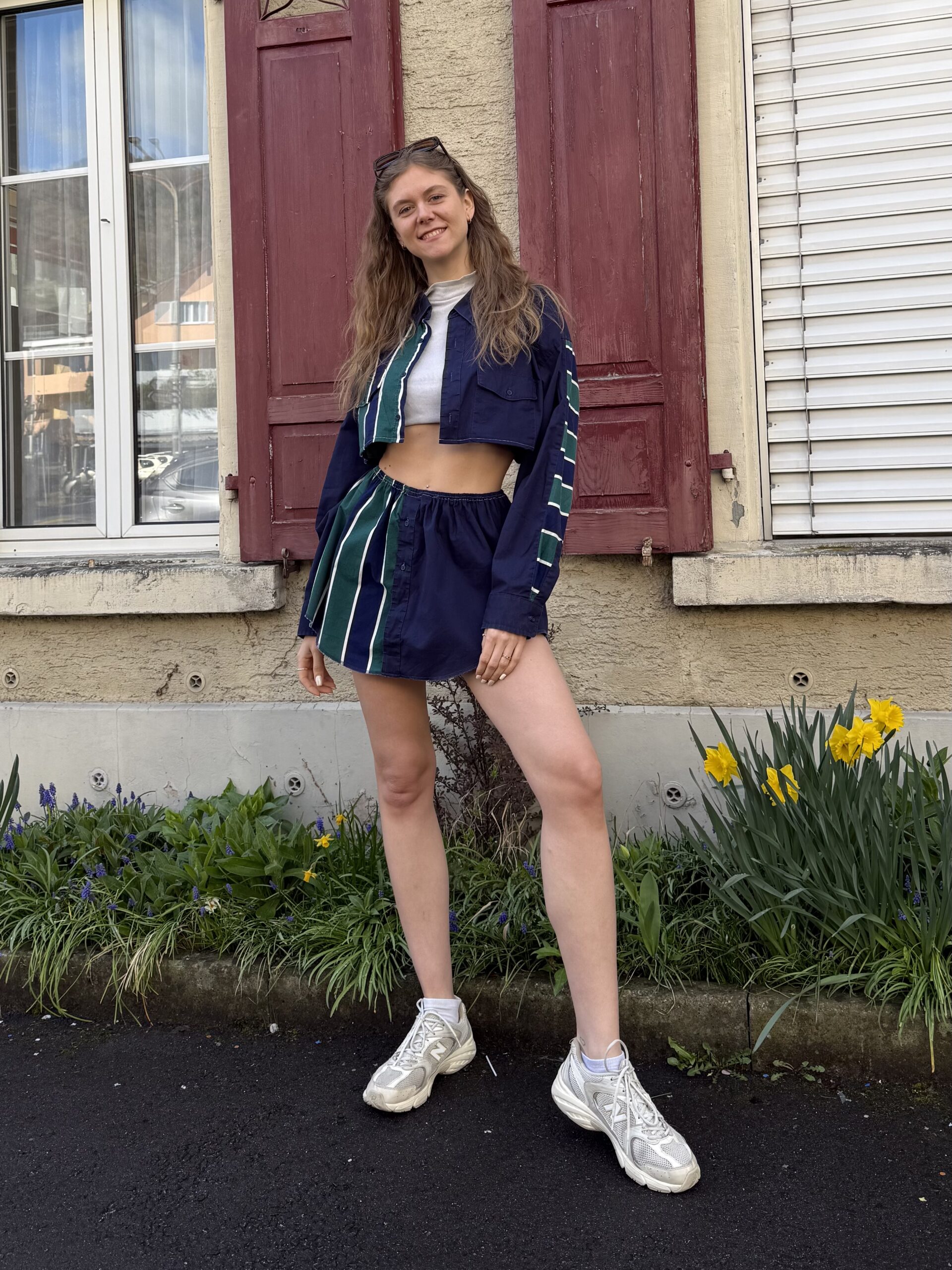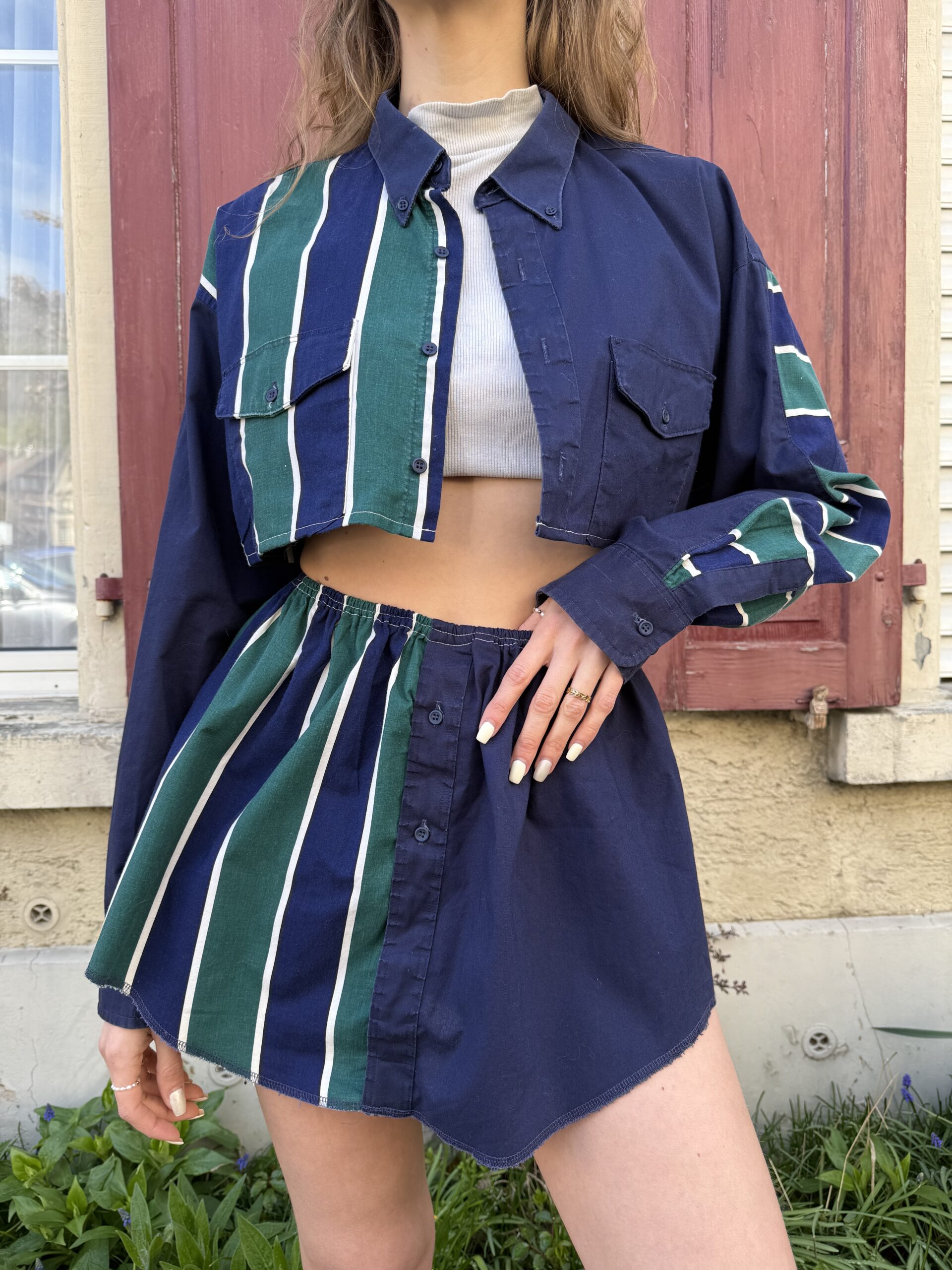 Dieses Upcycling-Zweiteiler-Set wurde aus einem alten Vintage Männerhemd gefertigt und verwandelt es in ein modernes Outfit – bestehend aus Cropped Shirt und passendem Rock.