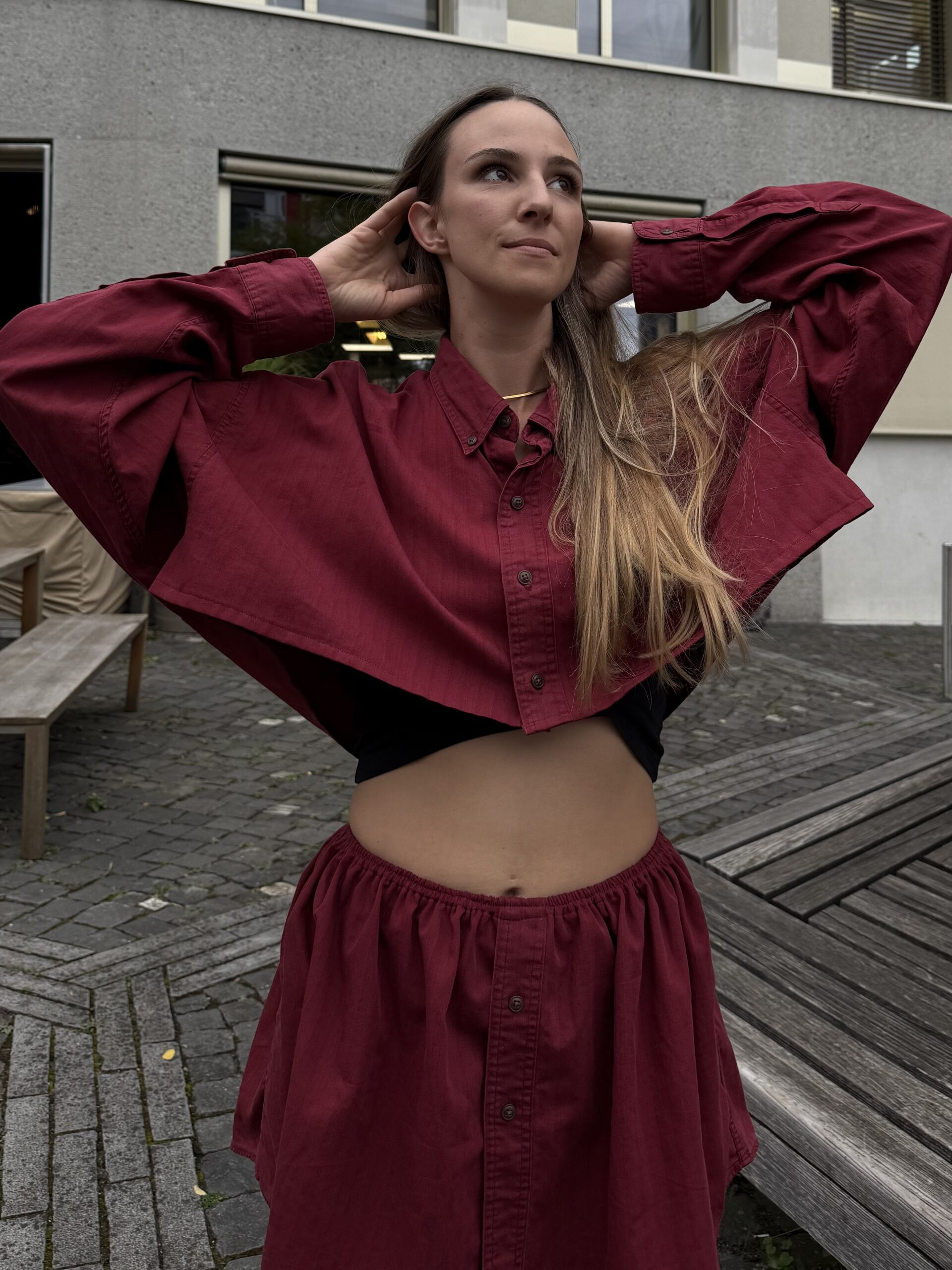 Dieses Upcycling-Zweiteiler-Set besteht aus einem Cropped Shirt und einem passenden Rock, gefertigt aus einem alten Hemd, das wir in ein modernes Outfit verwandelt haben. Die kräftige Farbe Dunkelrot – eine absolute Trendfarbe für den Herbst – macht das Set zu einem stylischen Statement, das gleichzeitig nachhaltig und einzigartig ist.