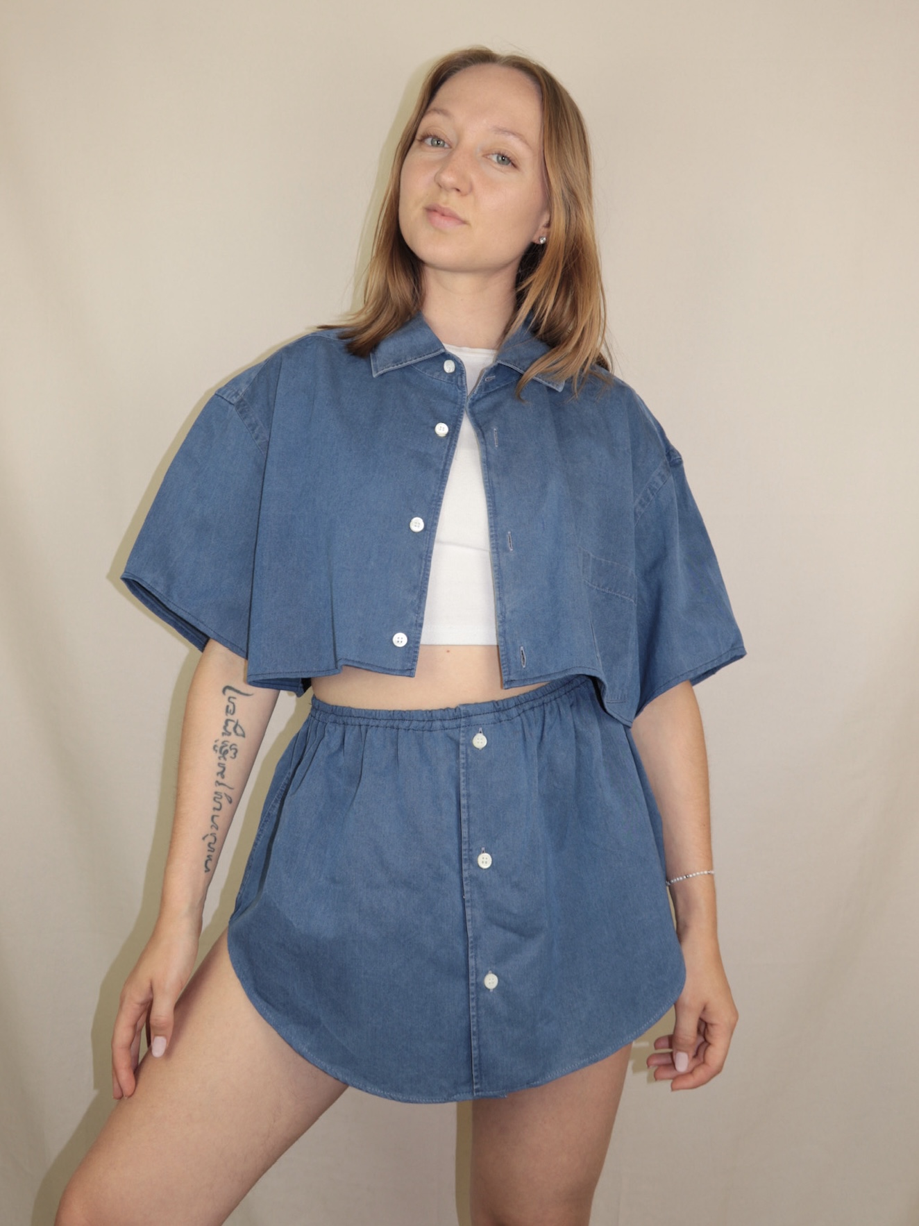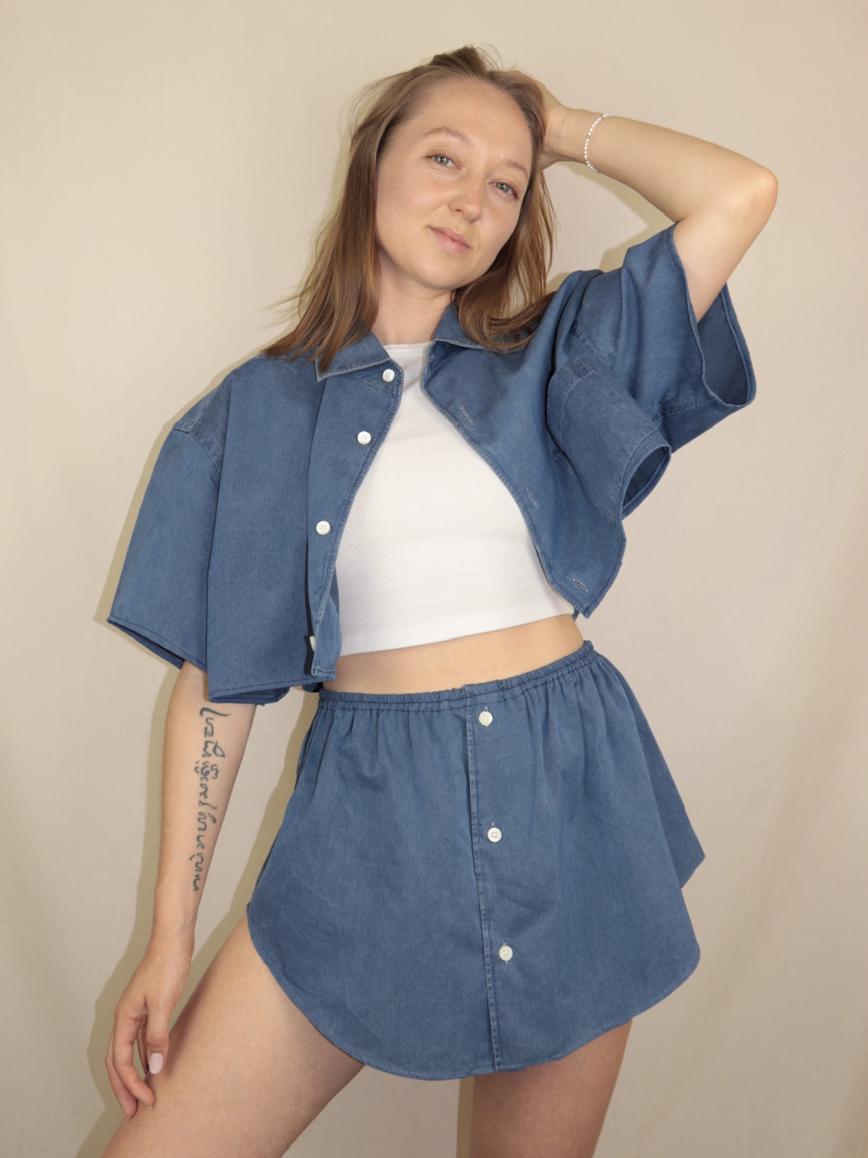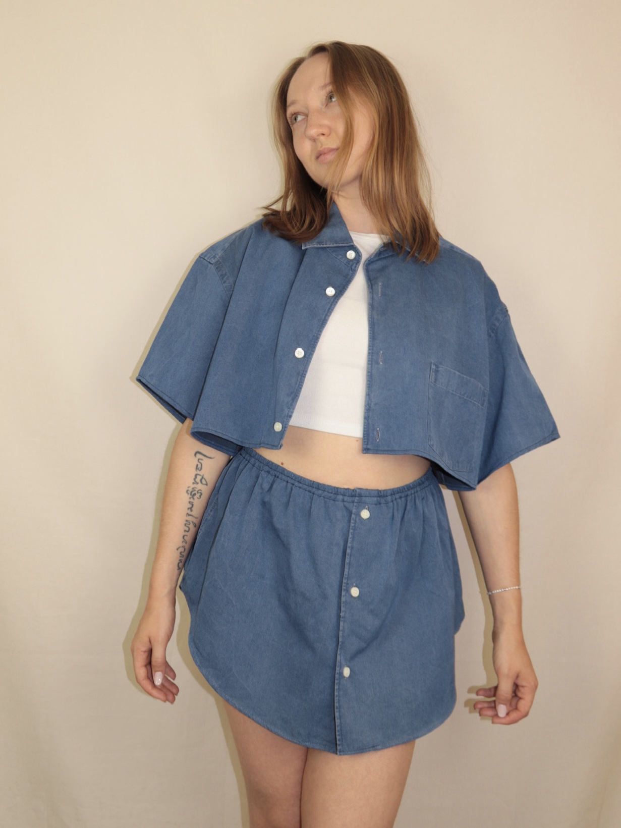 Dieses handgemachte Upcycling-Set besteht aus Rock und Oberteil – beide gefertigt aus einem einzigen Hemd, mit ganz viel Liebe. Jeder Zweiteiler ist ein Unikat, nachhaltig produziert und perfekt für warme Sommertage, Festivals oder einfach, wenn du Lust auf ein besonderes Outfit hast, das niemand sonst trägt.