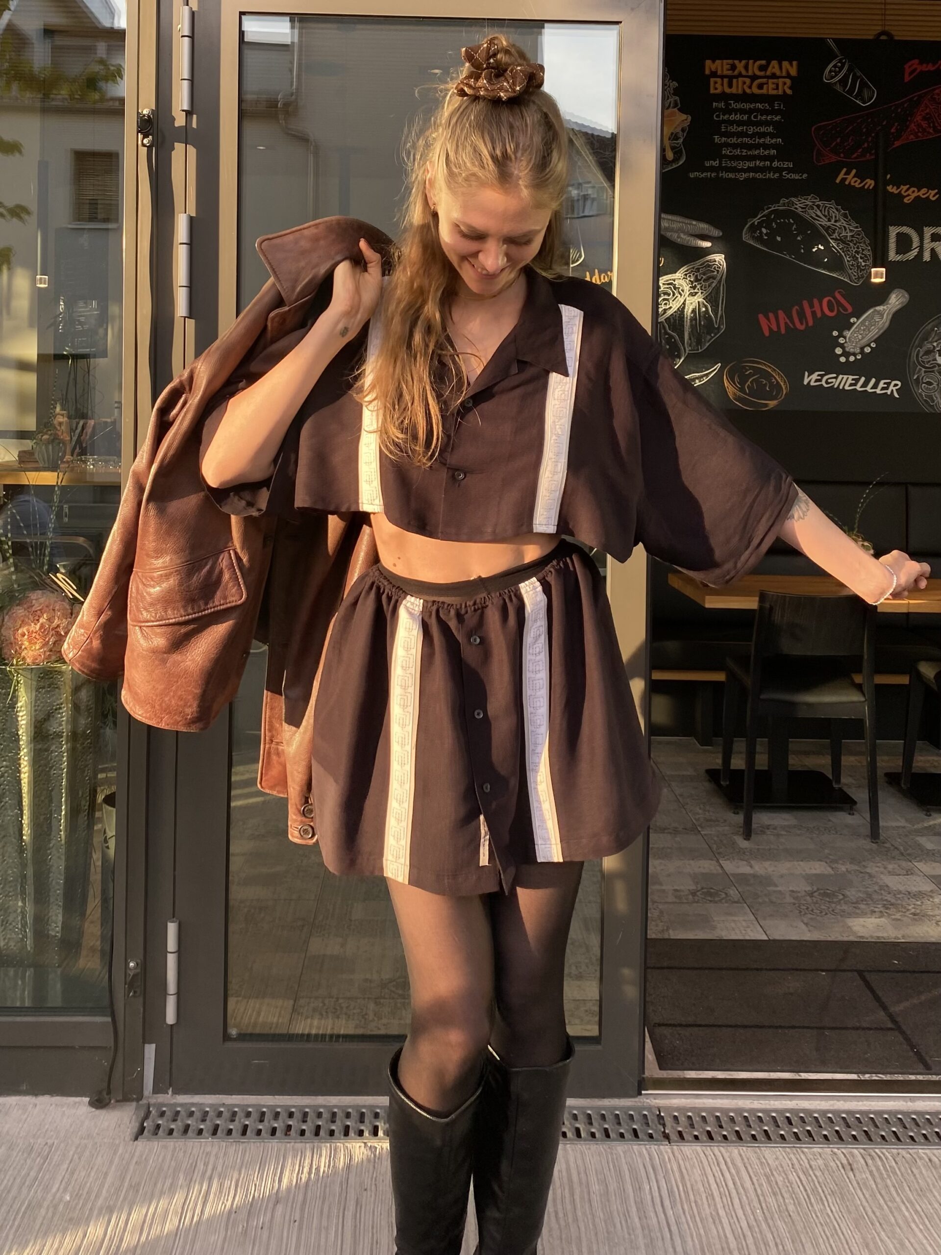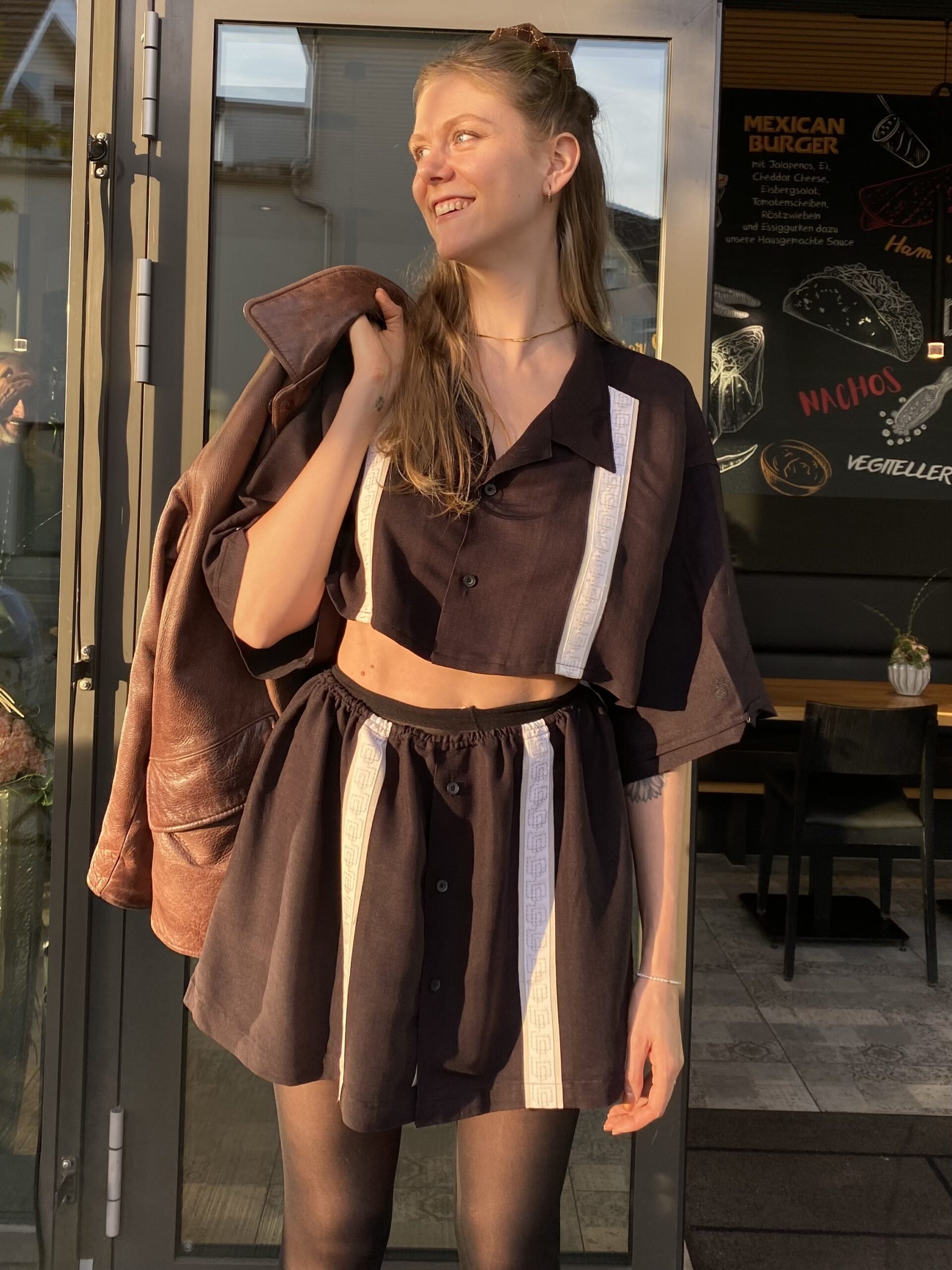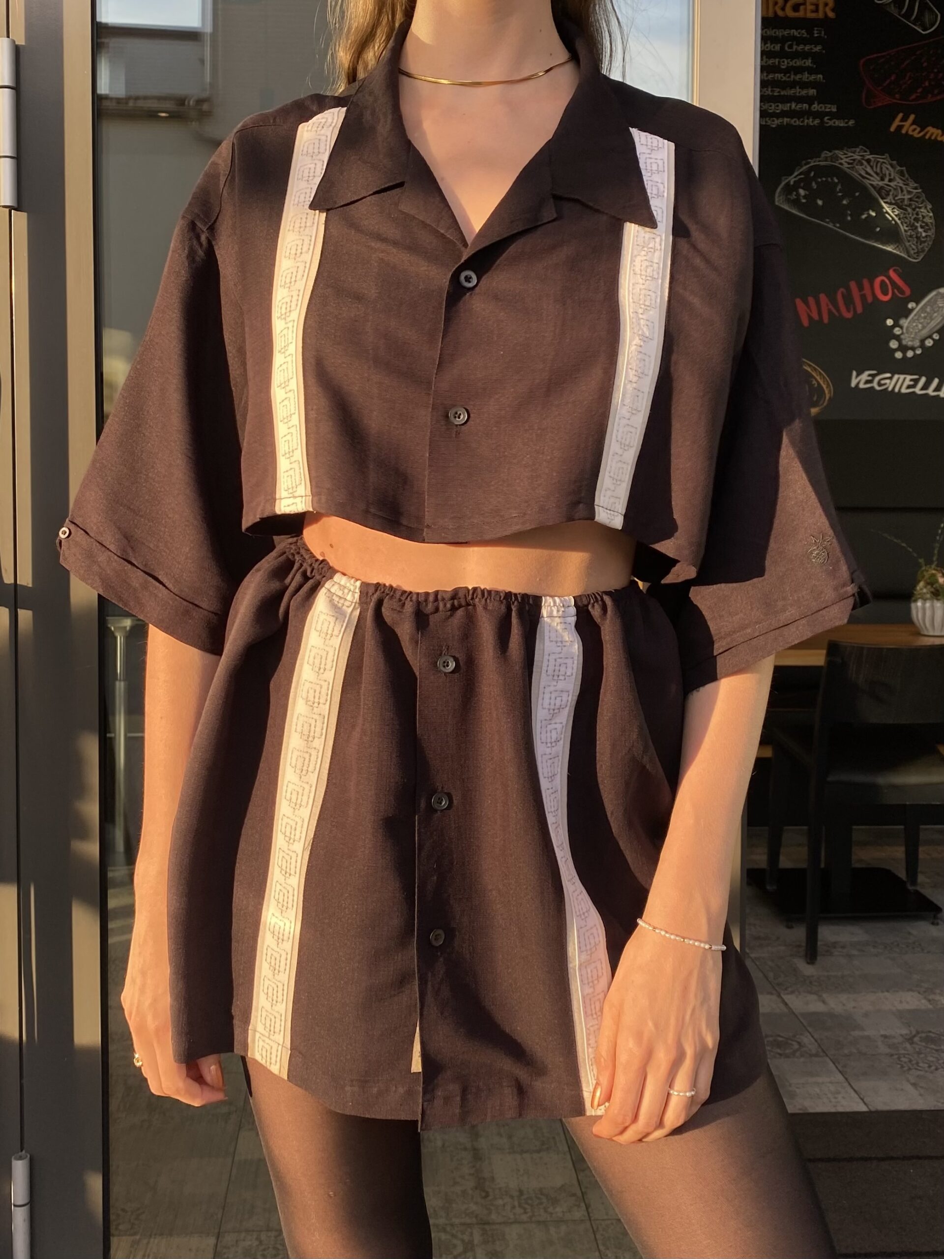 Dieses Upcycling-Zweiteiler-Set wurde aus einem alten Vintage Männerhemd gefertigt und verwandelt es in ein modernes Outfit – bestehend aus Cropped Shirt und passendem Rock.