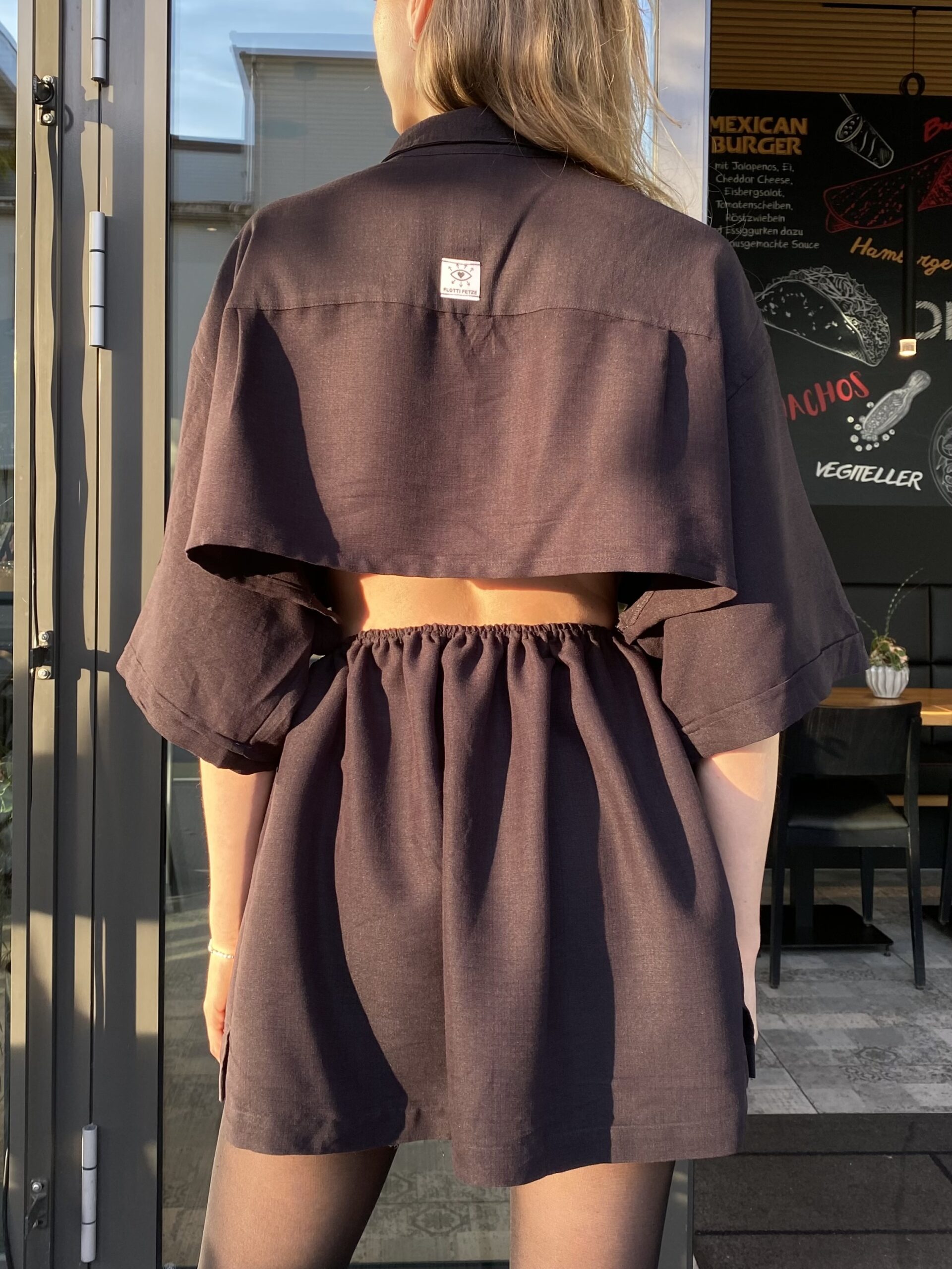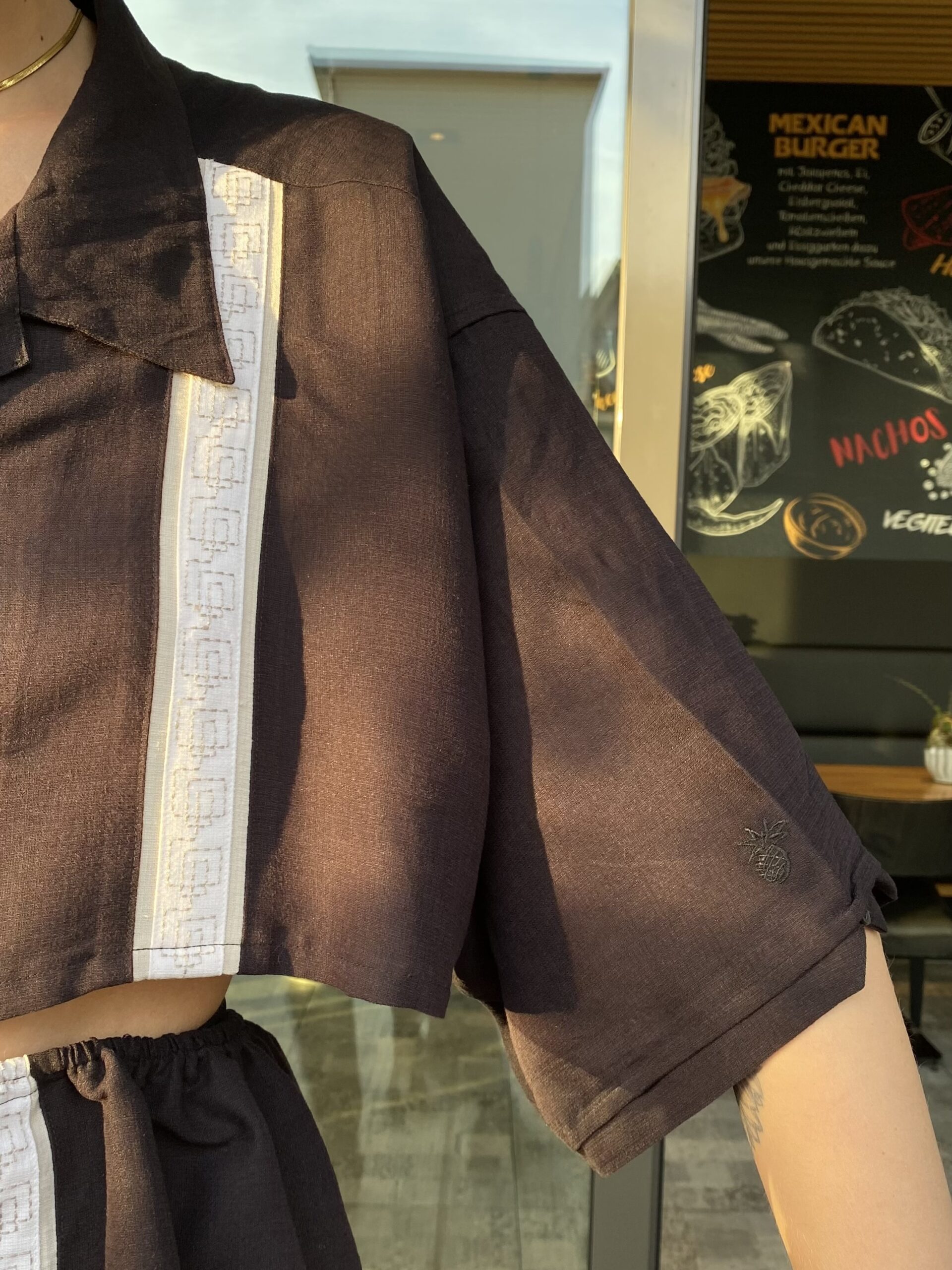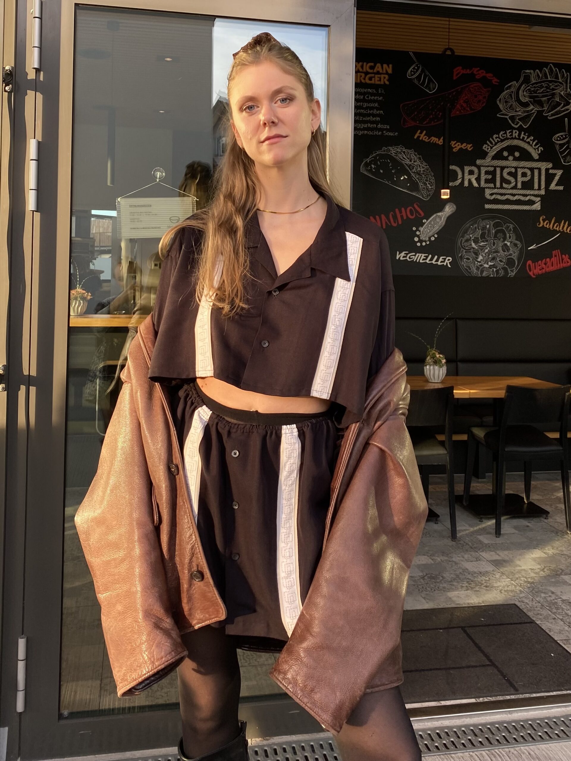 Dieses Upcycling-Zweiteiler-Set wurde aus einem alten Vintage Männerhemd gefertigt und verwandelt es in ein modernes Outfit – bestehend aus Cropped Shirt und passendem Rock.
