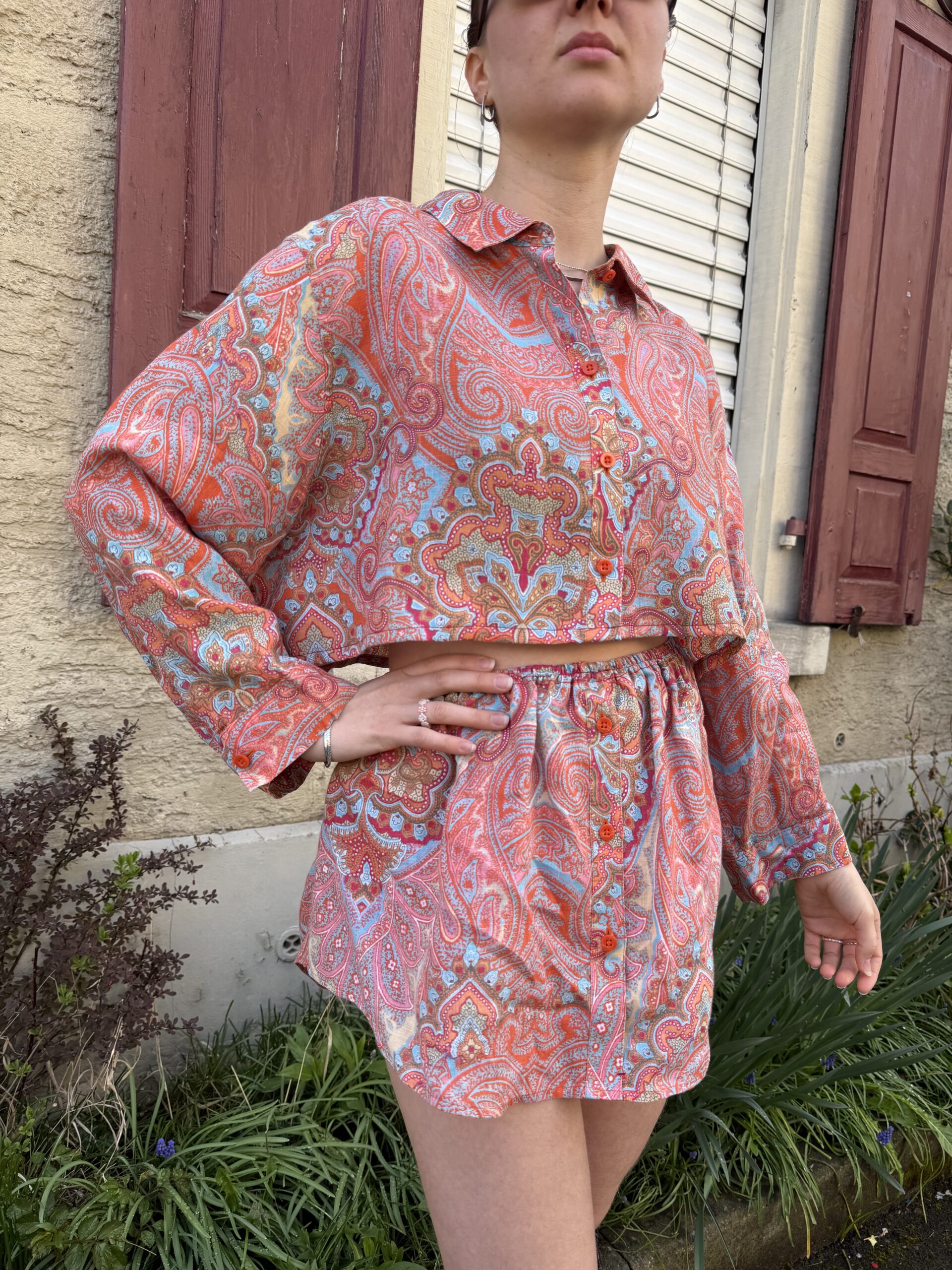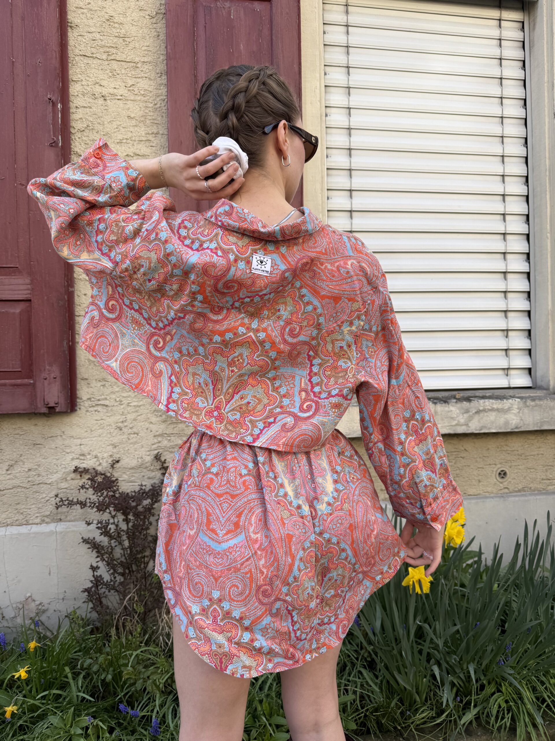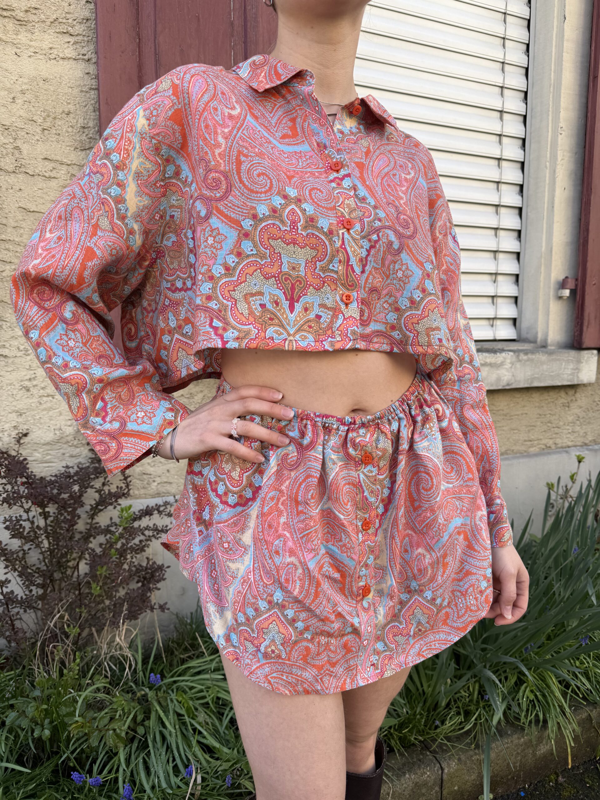 Dieses Upcycling-Zweiteiler-Set wurde aus einem alten Vintage Männerhemd gefertigt und verwandelt es in ein modernes Outfit – bestehend aus Cropped Shirt und passendem Rock.