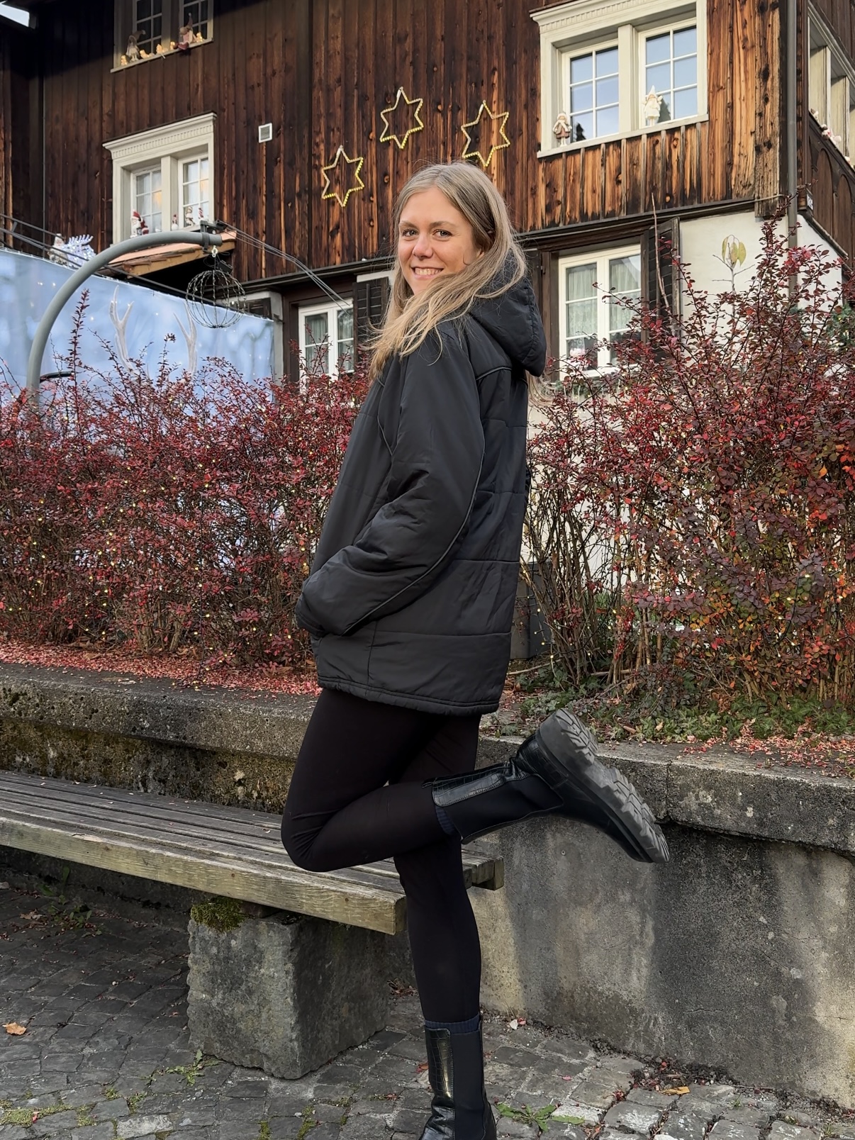 Blondine trägt Vintage Reebok Jacke